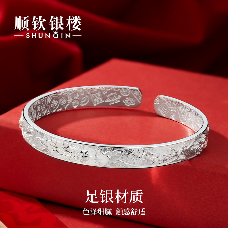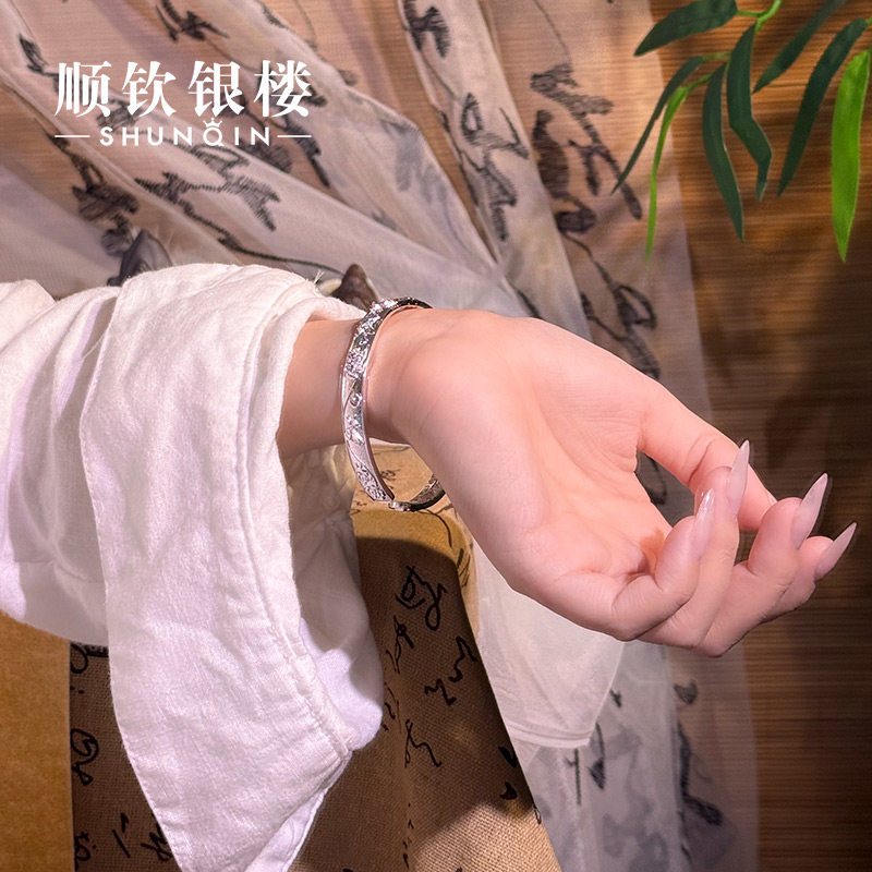 顺钦银楼S9999纯银手镯女玉珠足银镯子新中式银手饰古风好运礼物
