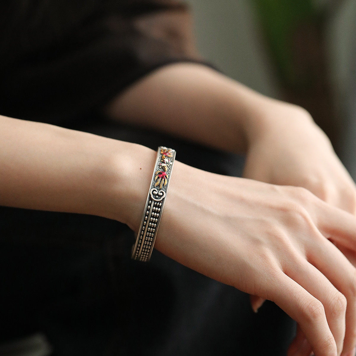 足银999珐琅如意双鱼开口手镯女复古算盘民族风实心镯子手环饰品
