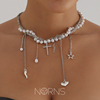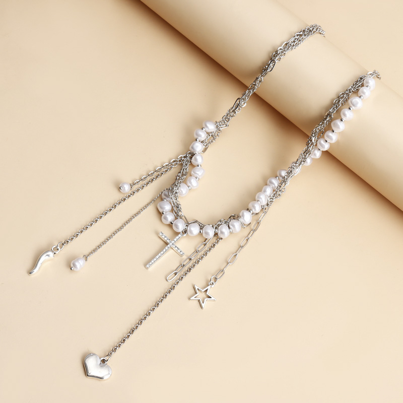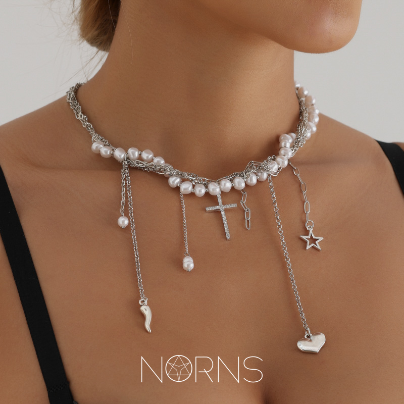 Norns欧美式多层合金链仿珍珠链缠绕长短流苏爱心十字架吊饰项链