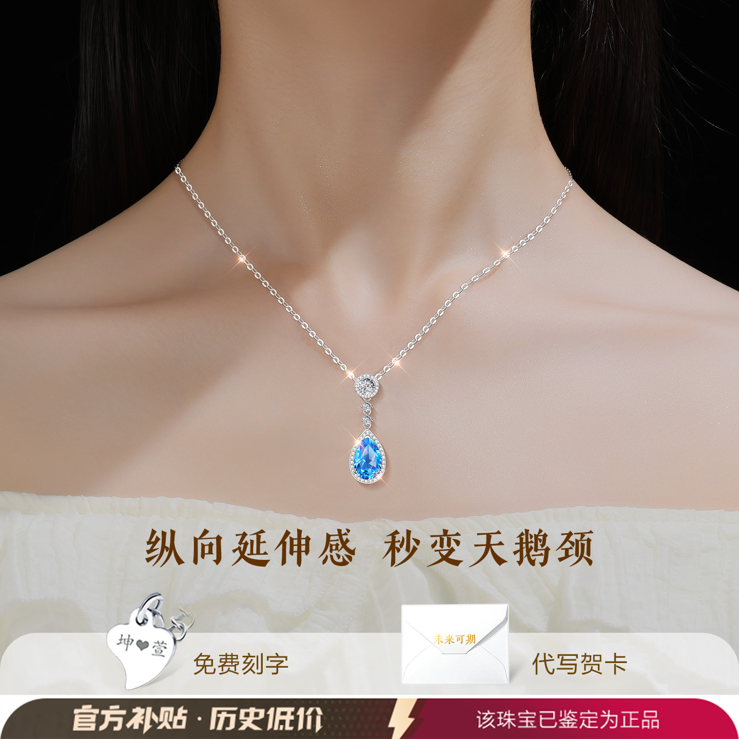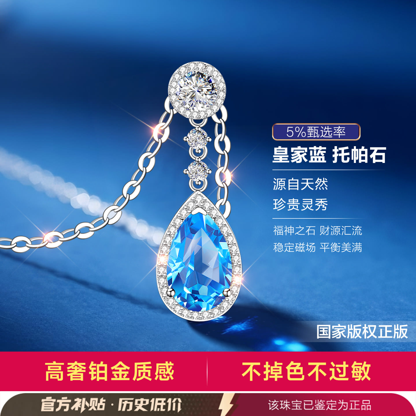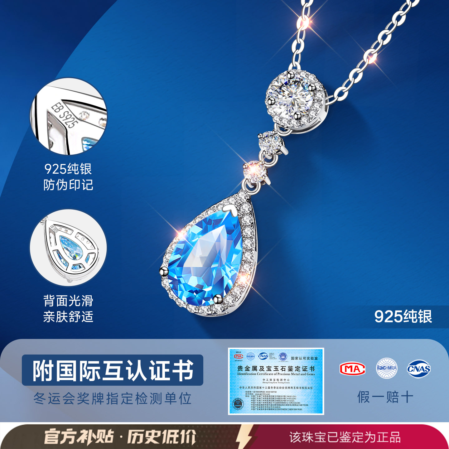 海洋之心天然蓝色宝石托帕石纯银项链女满钻奢华彩宝银吊坠高级感