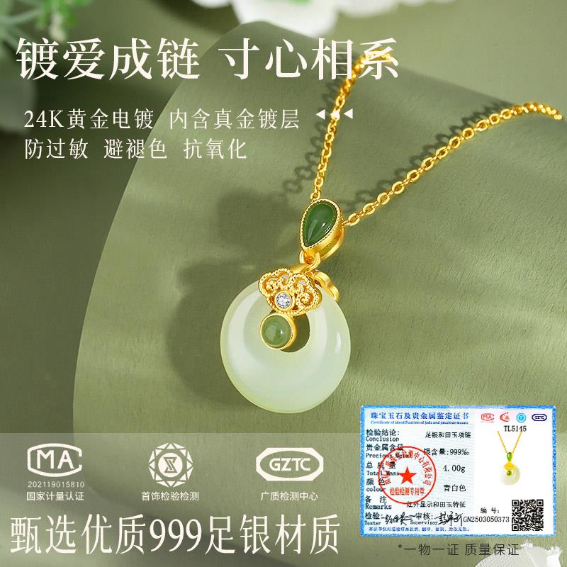 999纯银如意和田玉平安扣项链女款轻奢天然玉吊坠生日礼物送妈妈
