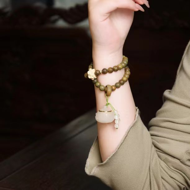 非金属木质手链 【花开并蒂】双圈绿檀8mm圆珠夜光莲花香囊款