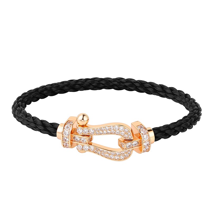 香港马蹄扣手链女18K玫瑰金光面半钻满钻黑色手绳航海扣情侣手环