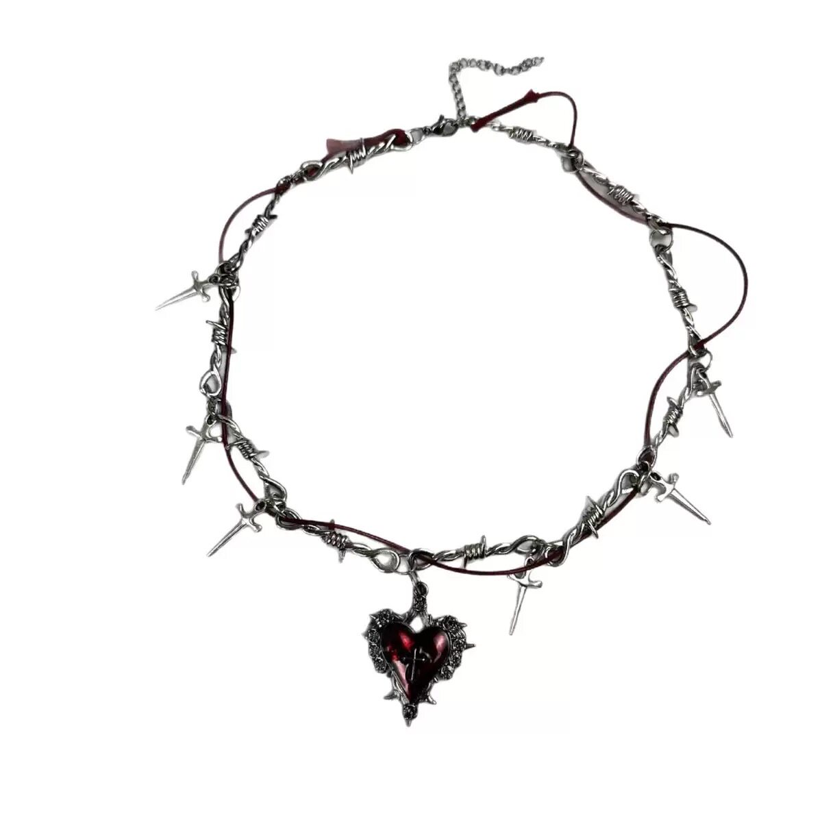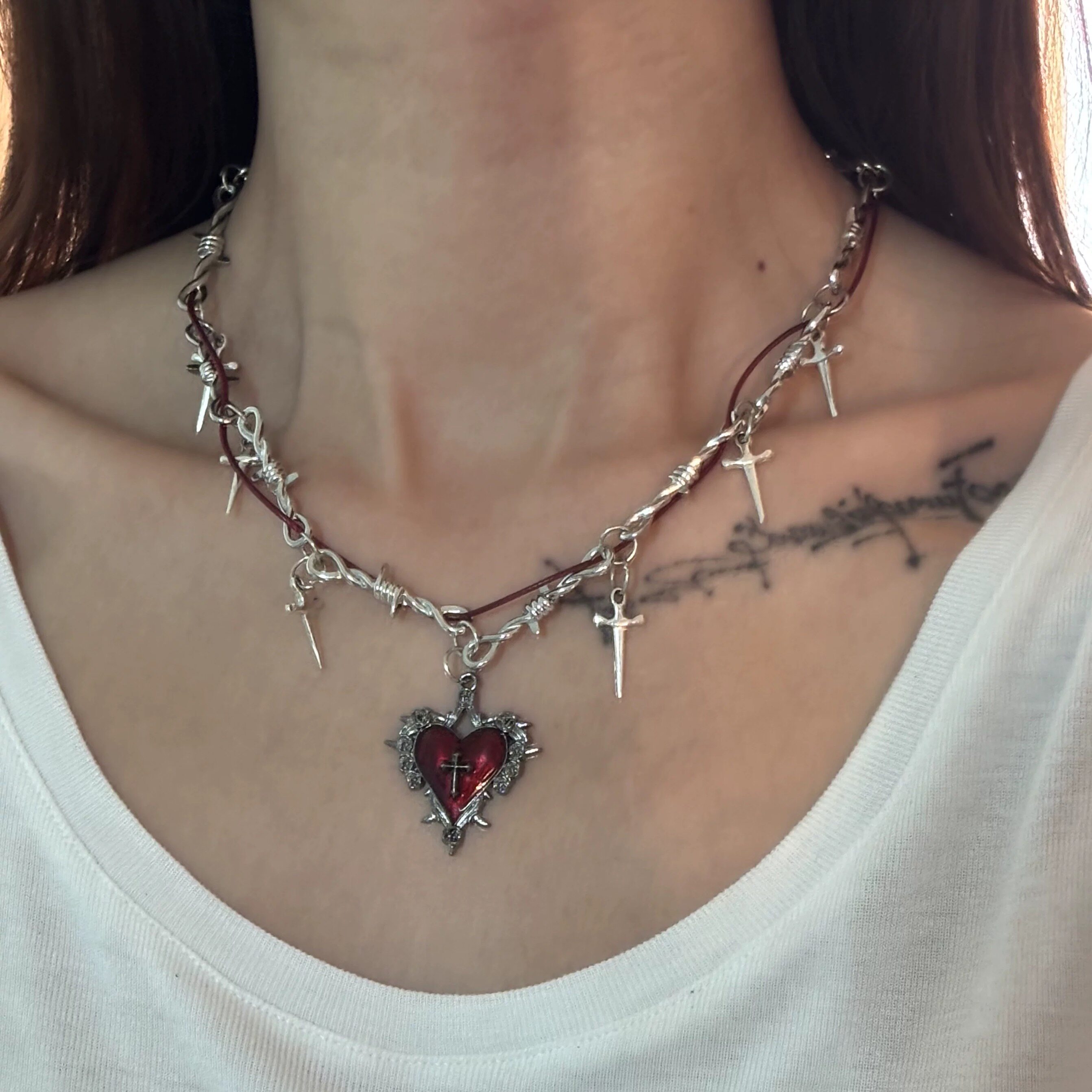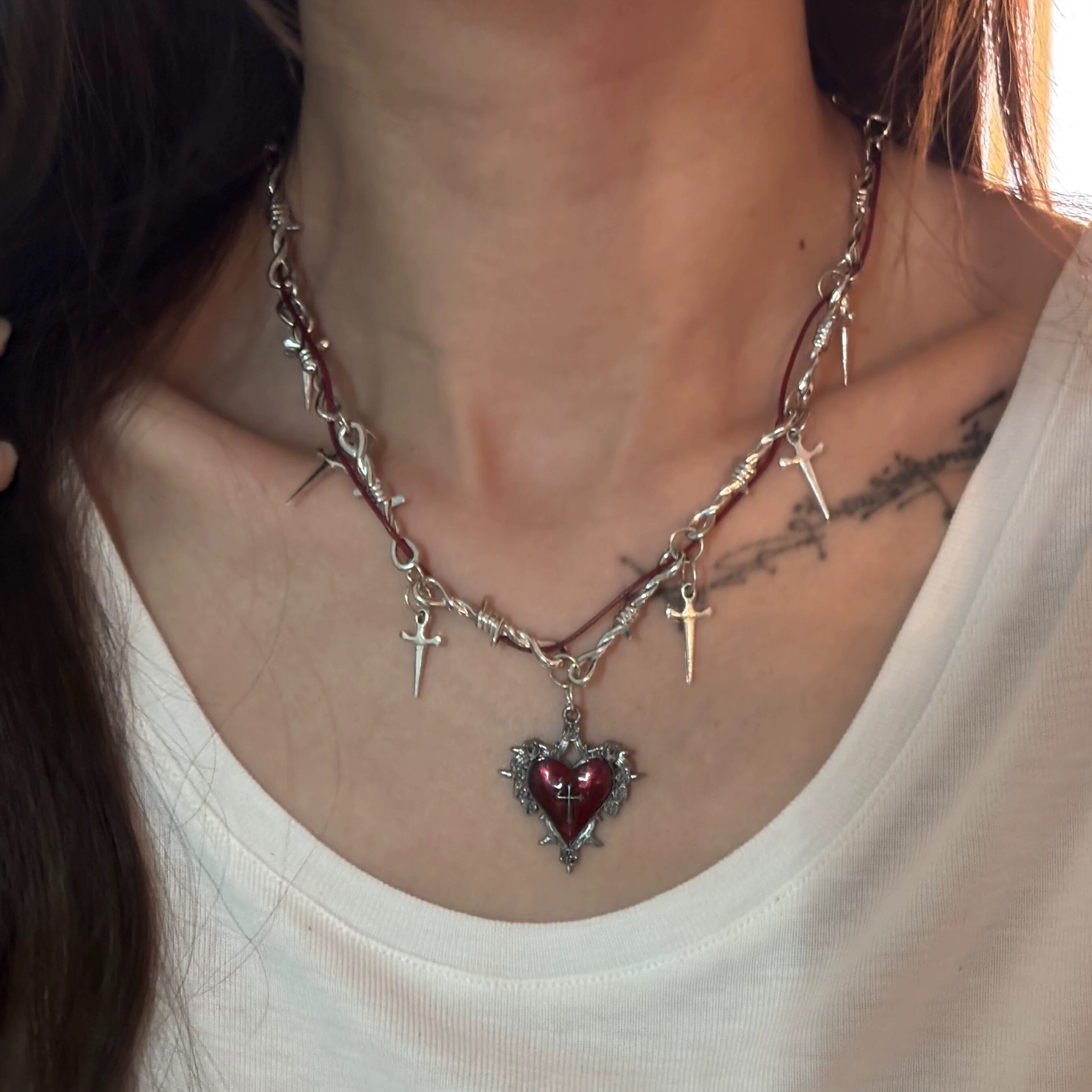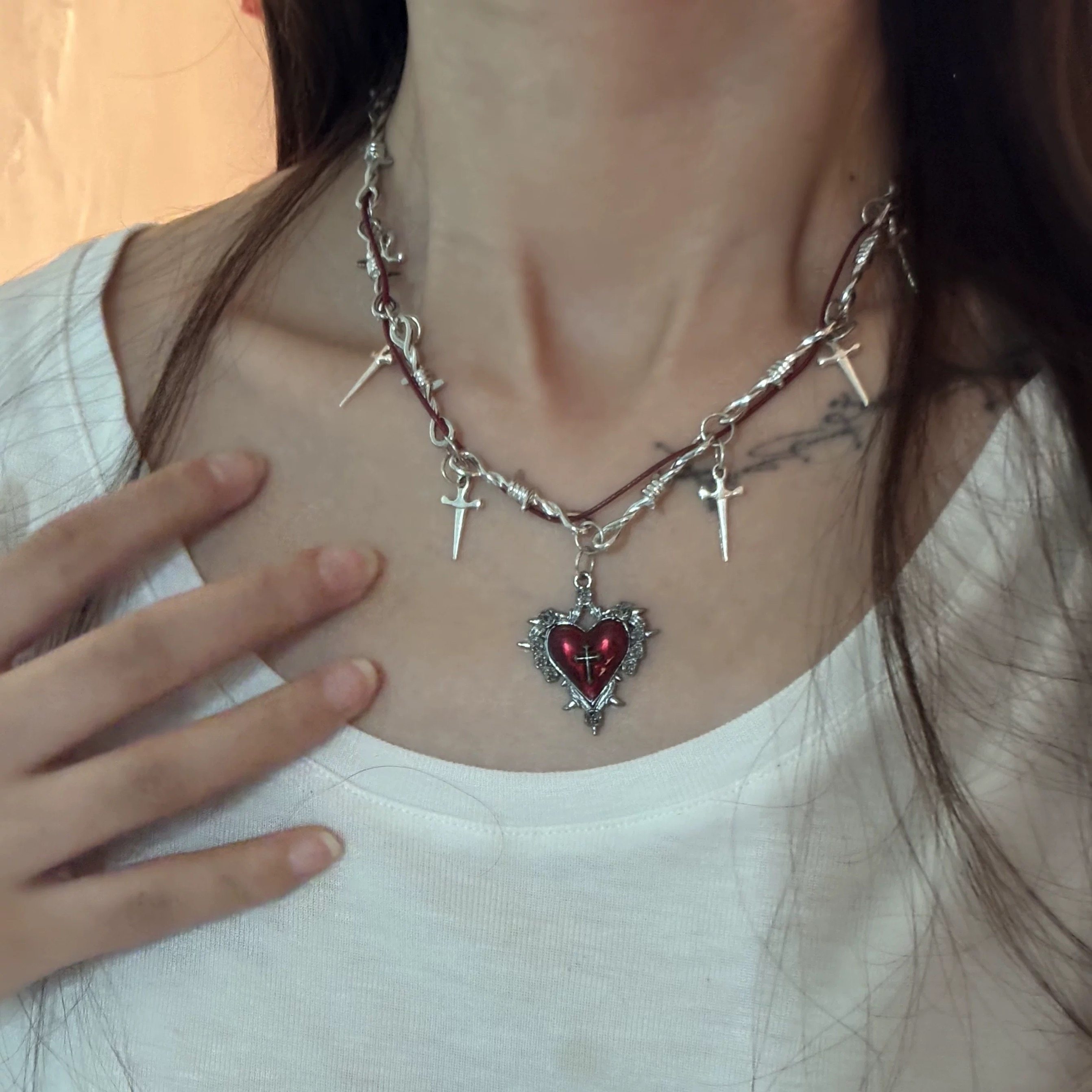 甜酷荆棘缠绕项链红色爱心金属朋克锁骨链辣妹y2k十字架配饰