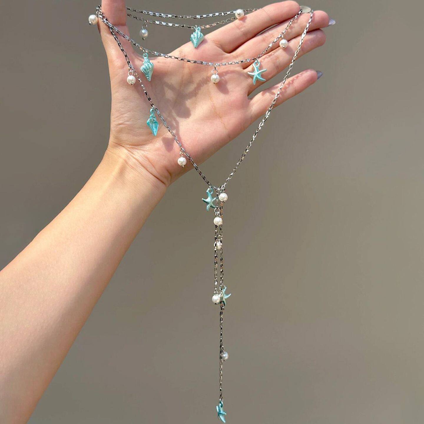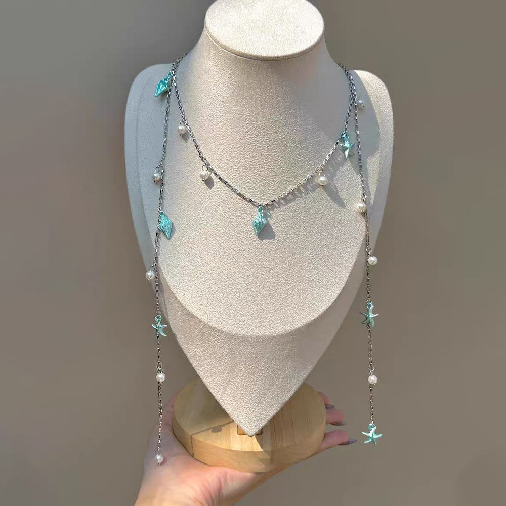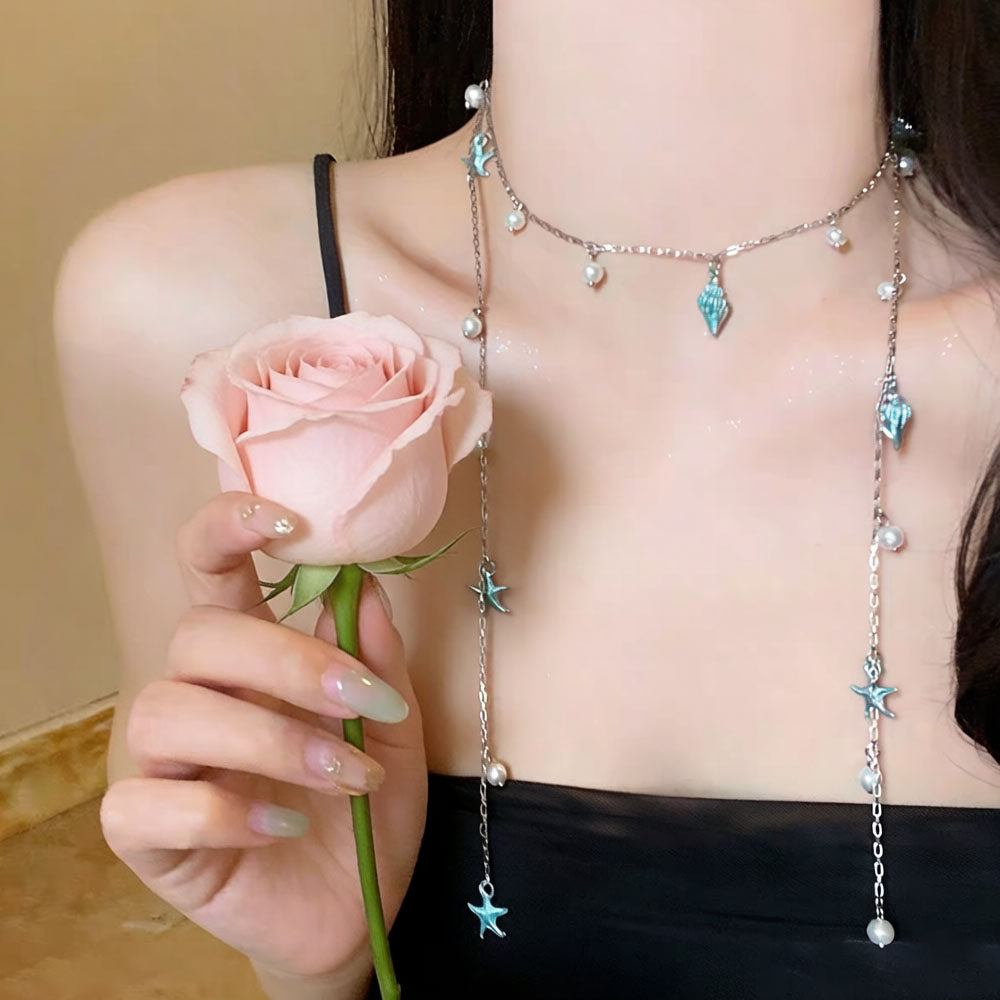 清新优雅蓝色海星海螺珍珠流苏项链长款夏天配裙子海边度假锁骨链