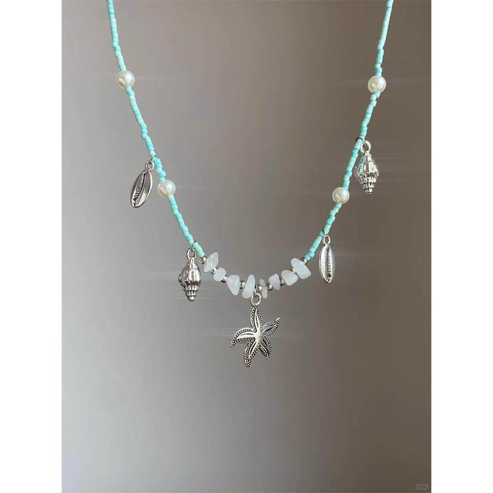 夏日清新蓝色串珠海星项链海边甜美度假风海螺贝壳锁骨链小众颈链