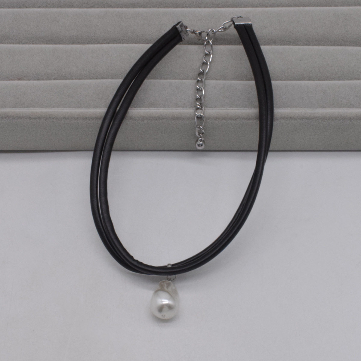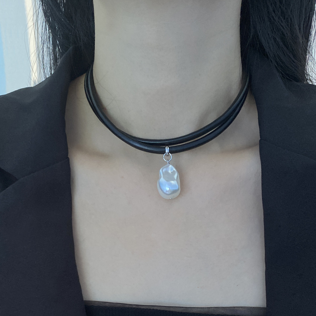 异型巴洛克风珍珠吊坠黑色皮质双层颈链颈圈项链锁骨链新款配饰