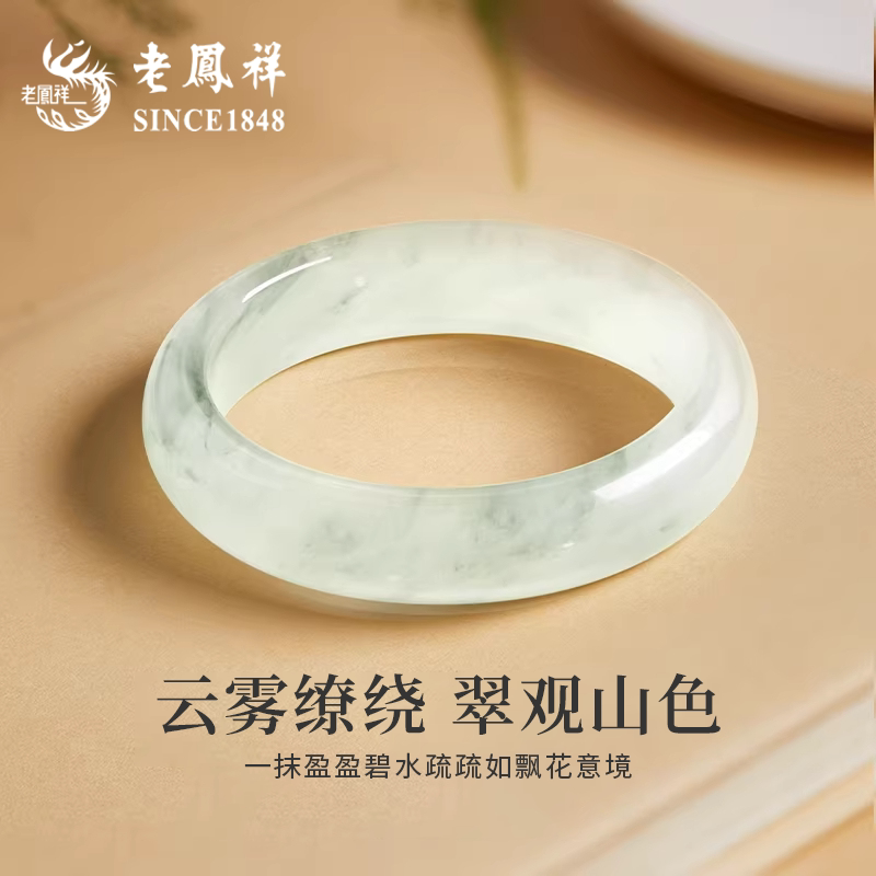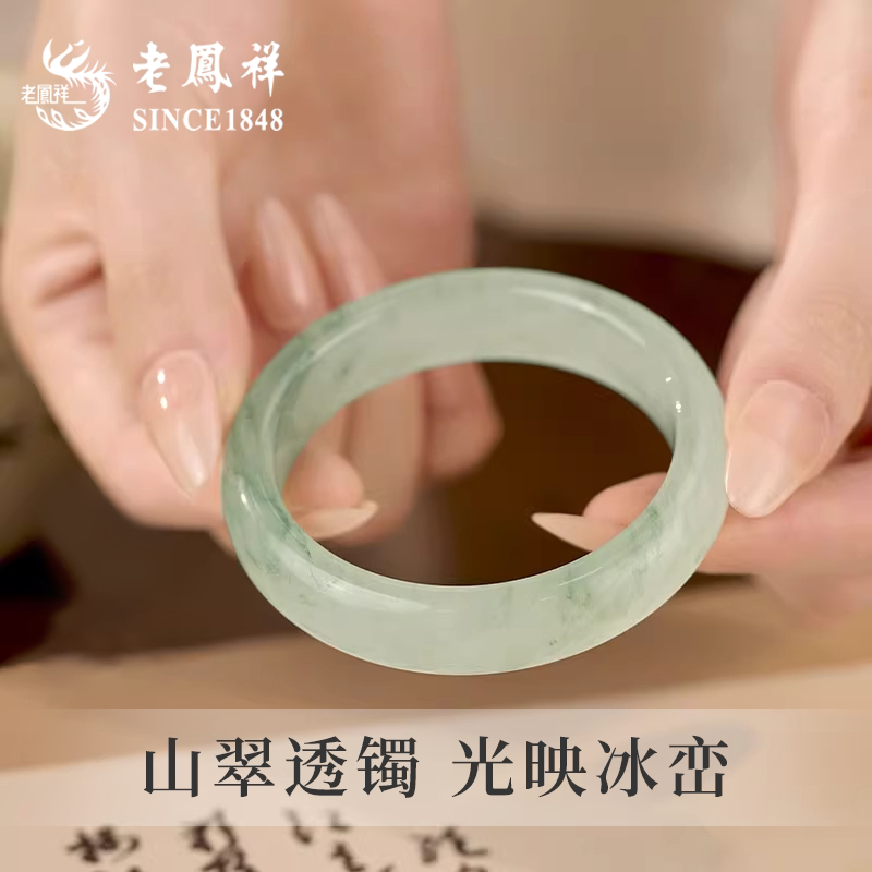 老凤祥天山翠玉手镯女款冰种飘花玉镯子天然玉石生日礼物送女友