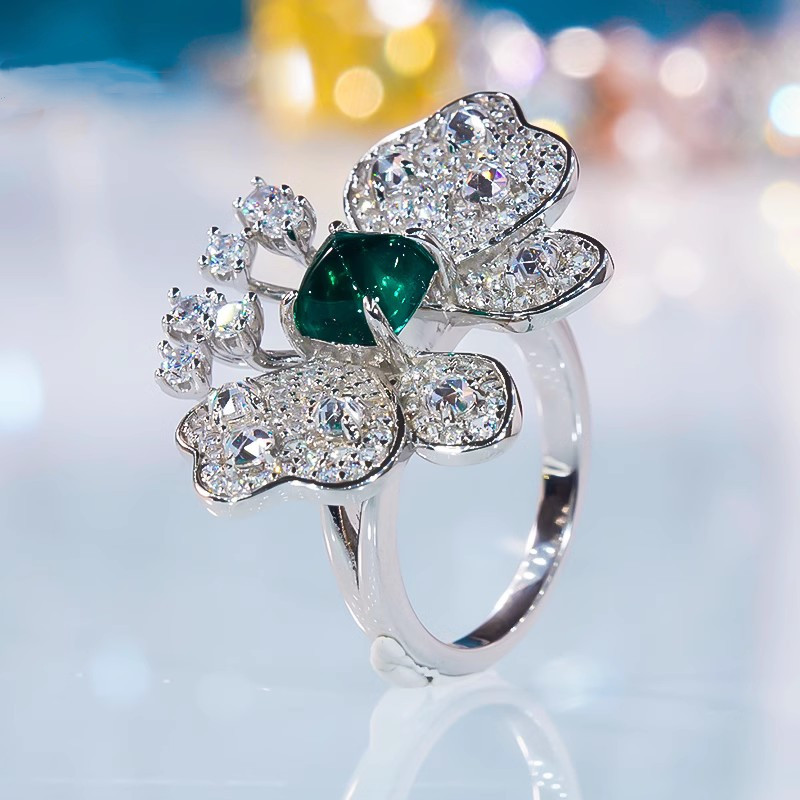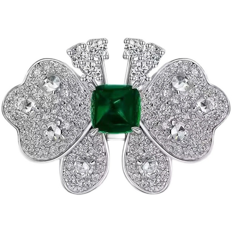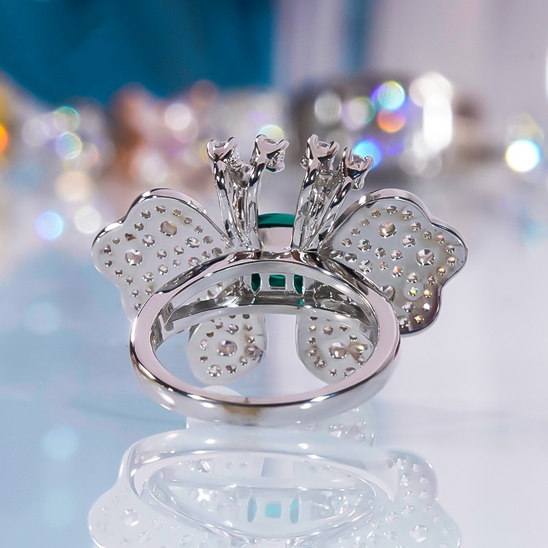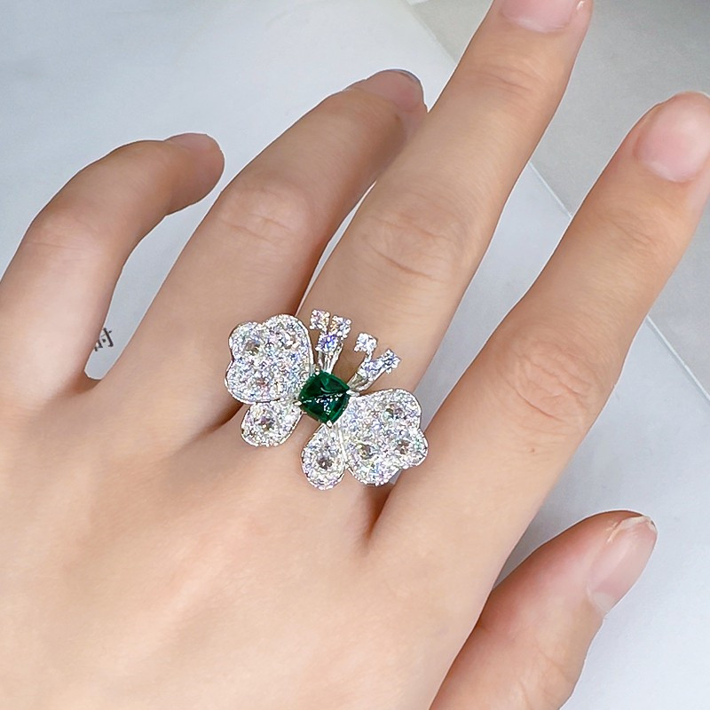 PT950铂金D色莫桑石满钻祖母绿蝴蝶戒指纯银1.5克拉钻戒晚宴奢华
