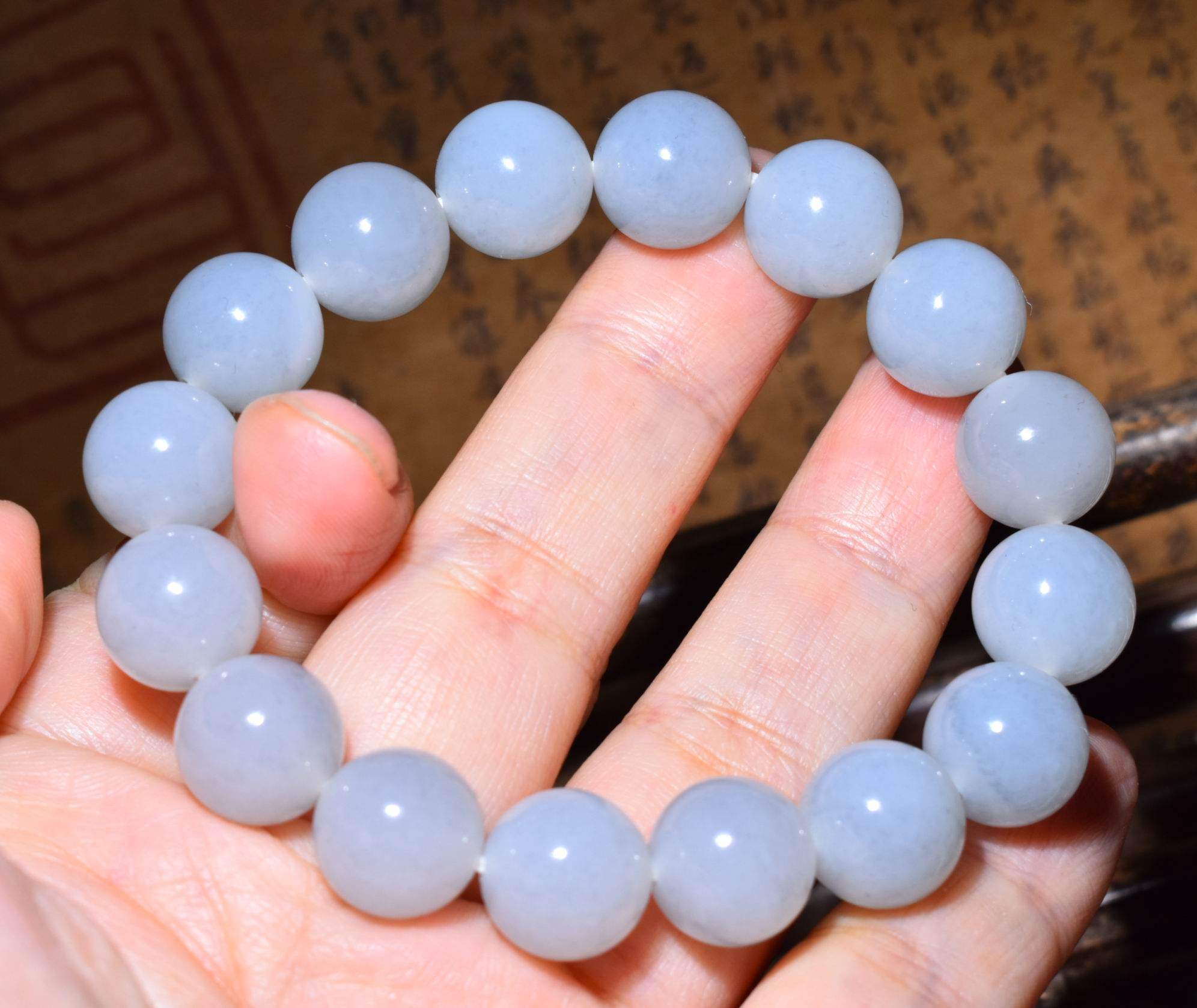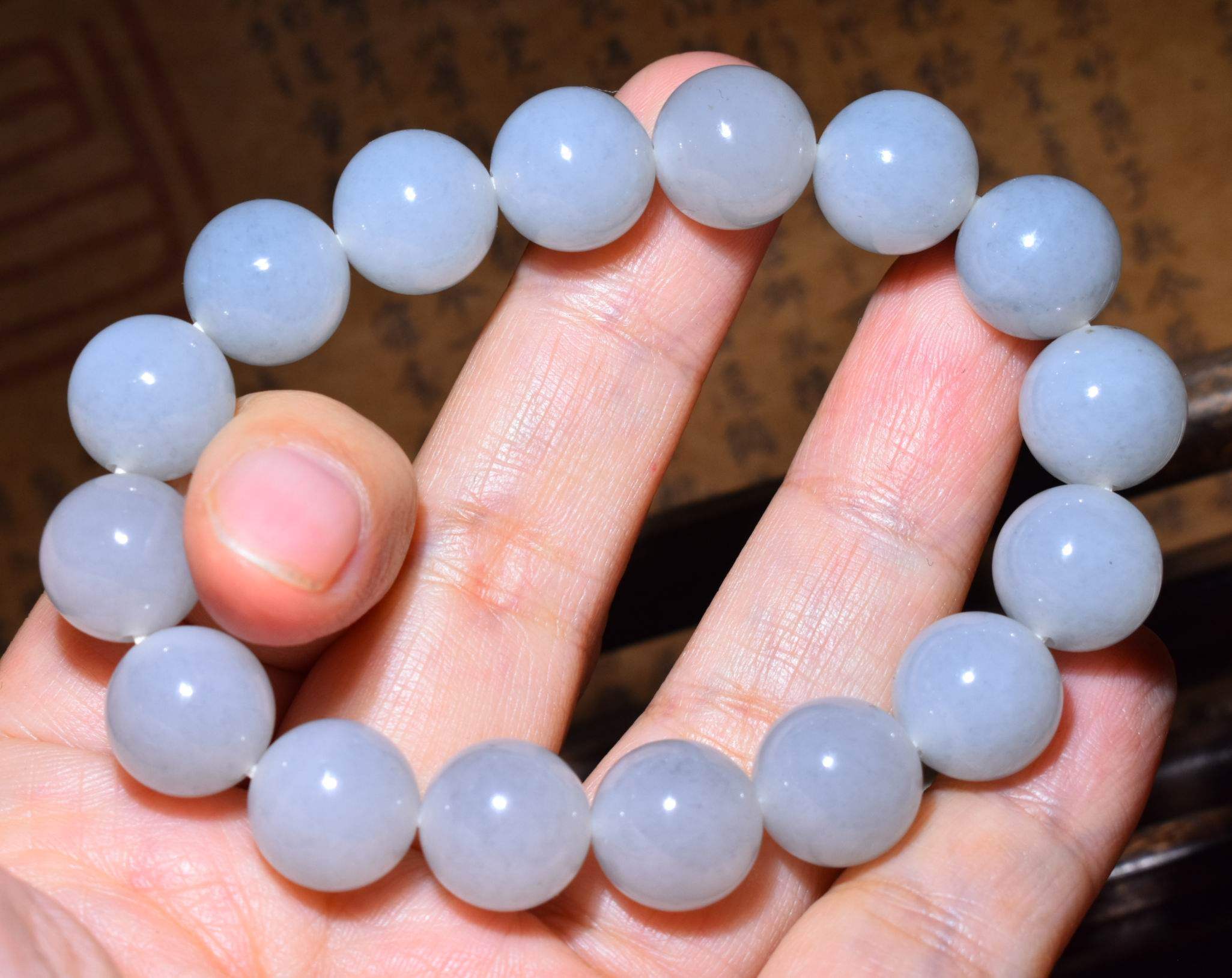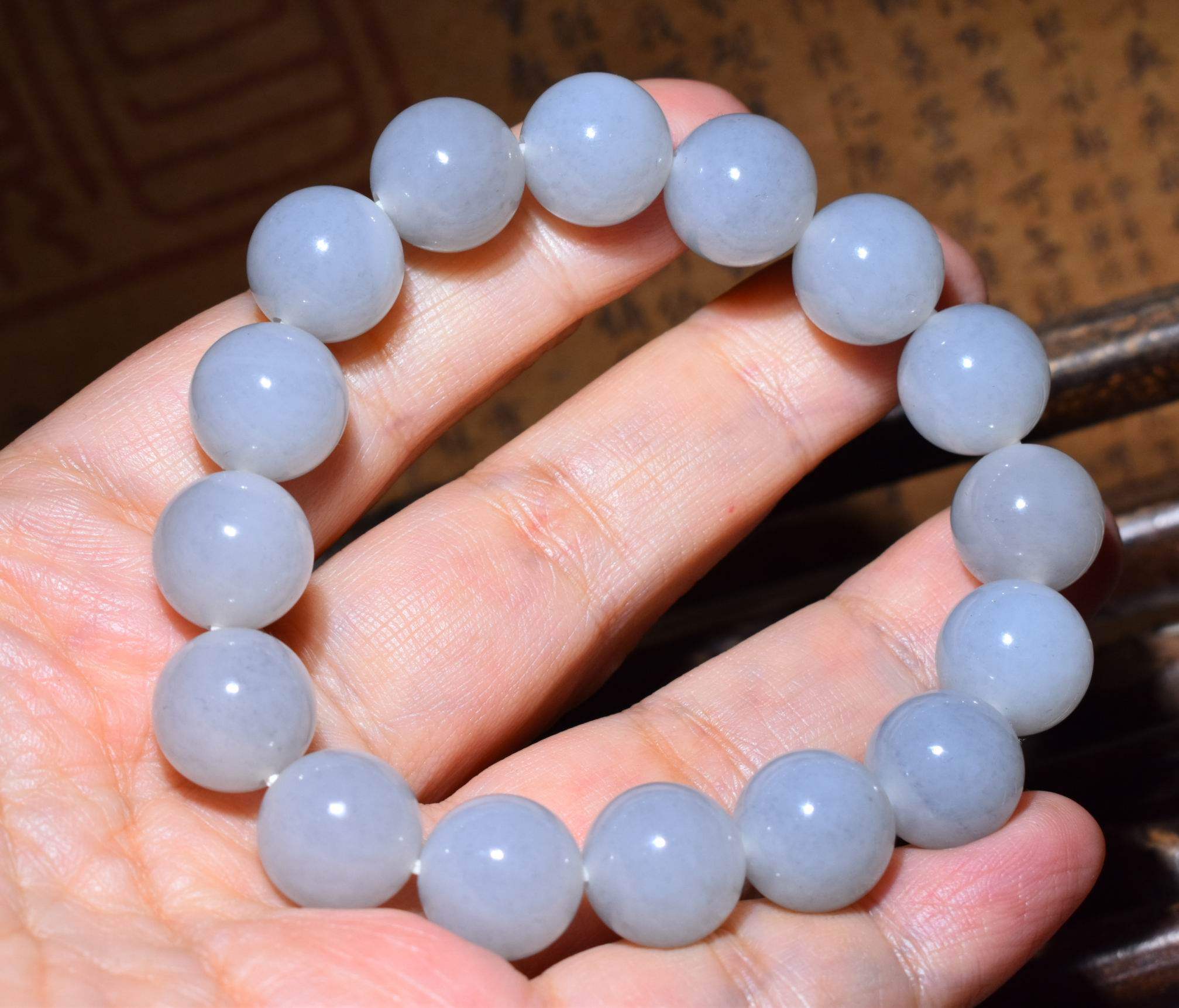 新疆的猫JJ121503 44.5克,12mm淡雅白玉底青花籽料圆珠手链