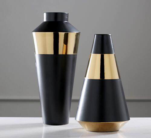 简约现代样板间电镀哑黑色金边陶瓷轻奢圆锥形几何花瓶插花器摆件