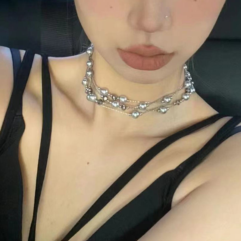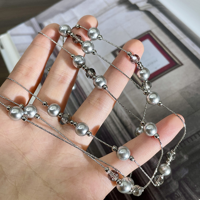 银灰色珍珠满天星颈链长款串珠项链小众设计感毛衣链女锁骨链配饰