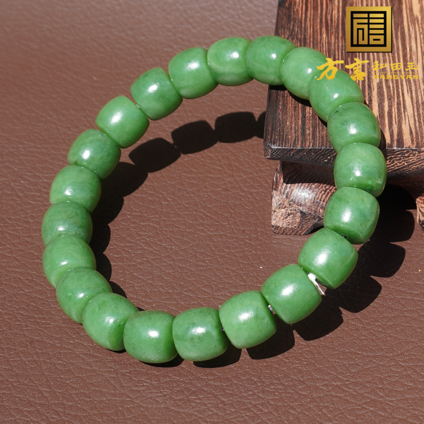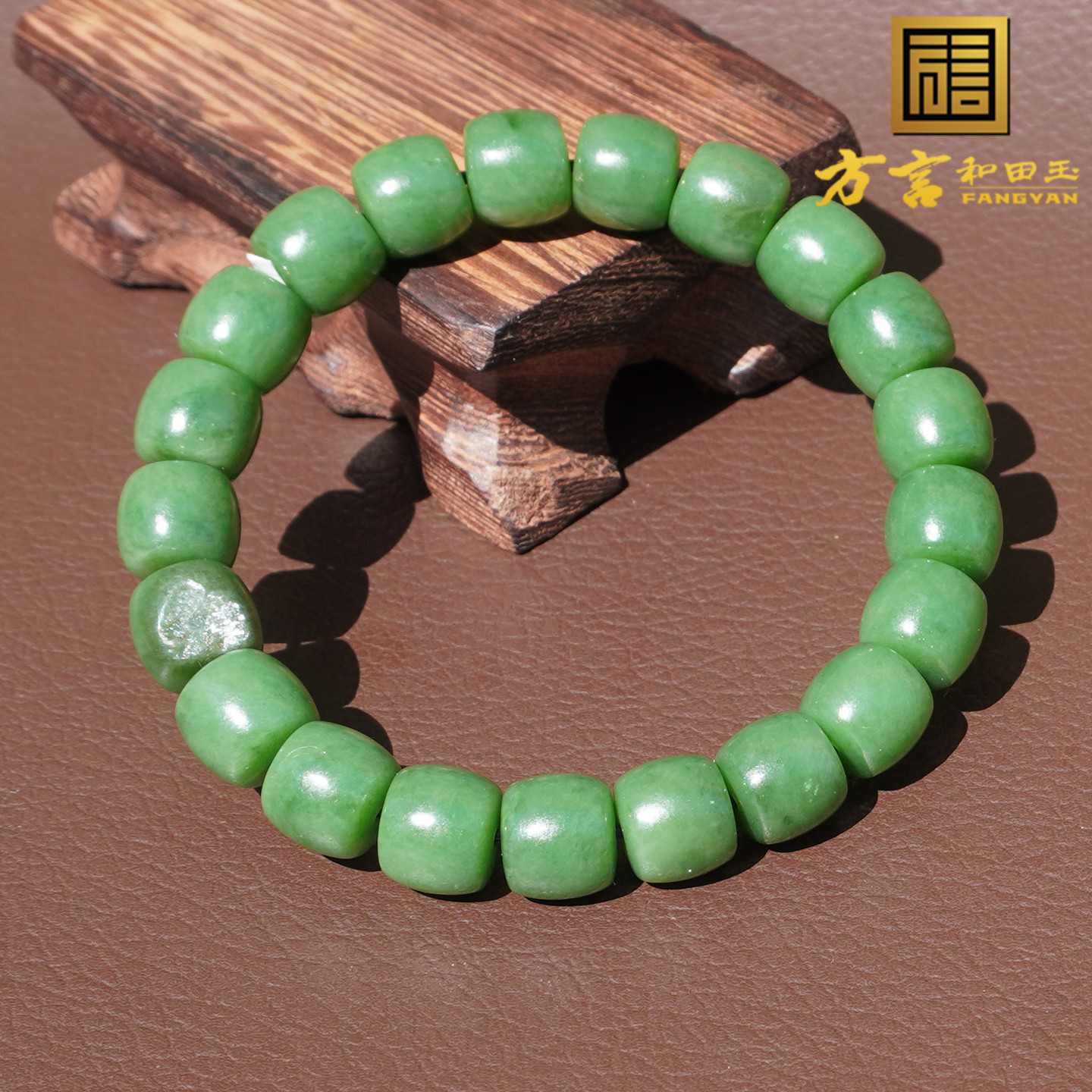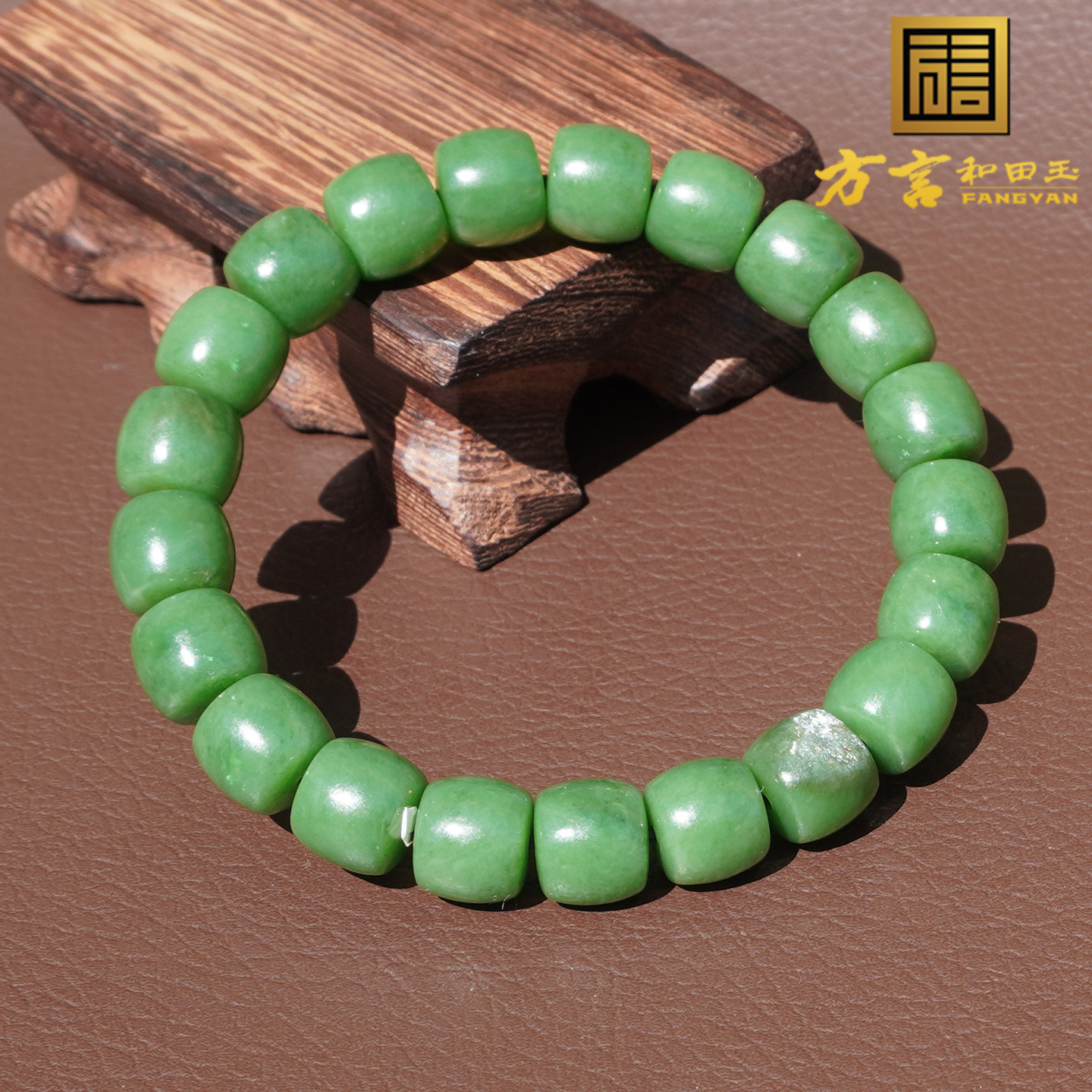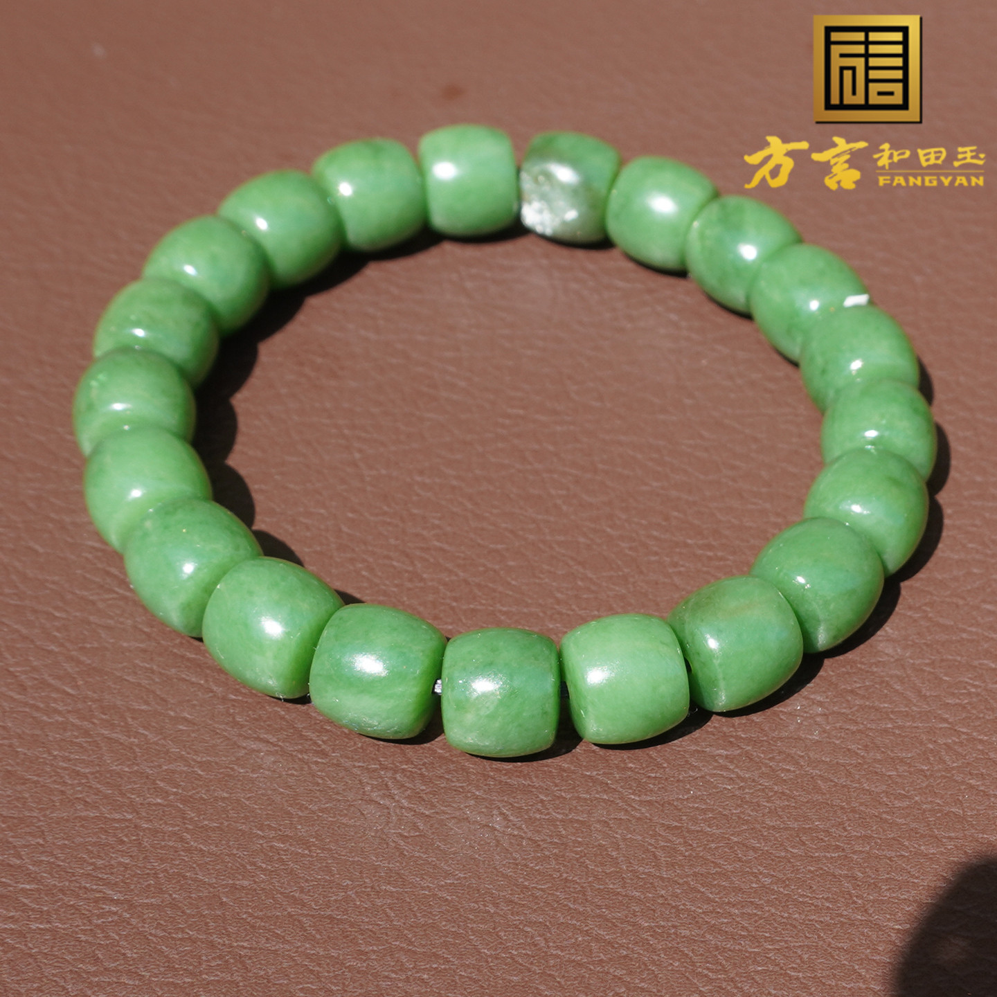 方言和田玉新疆老熟留原皮油润细腻果绿色碧玉籽料10mm直切手链A6