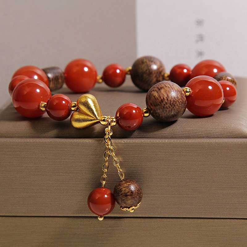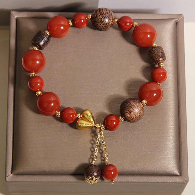 天然南红玛瑙手链女轻奢小众精致沉香木质手串沙金爱心串珠手环潮