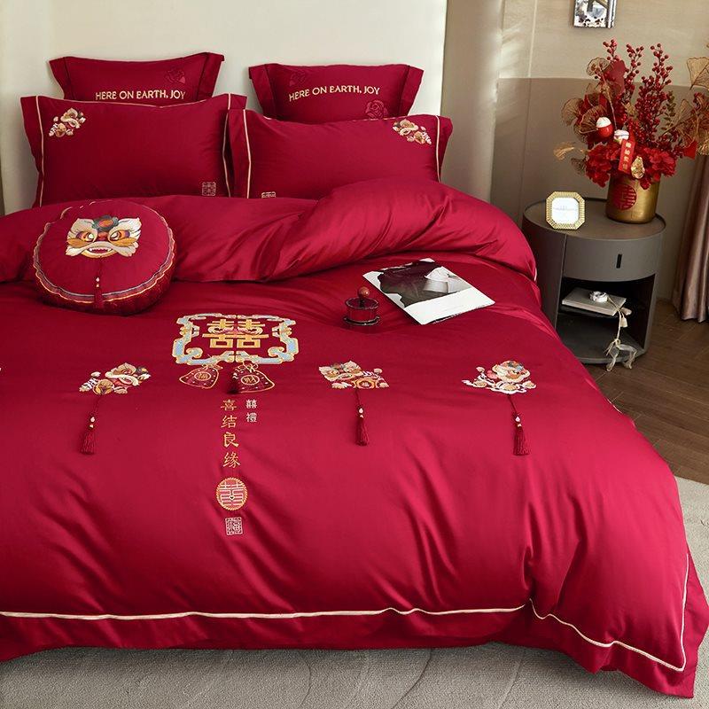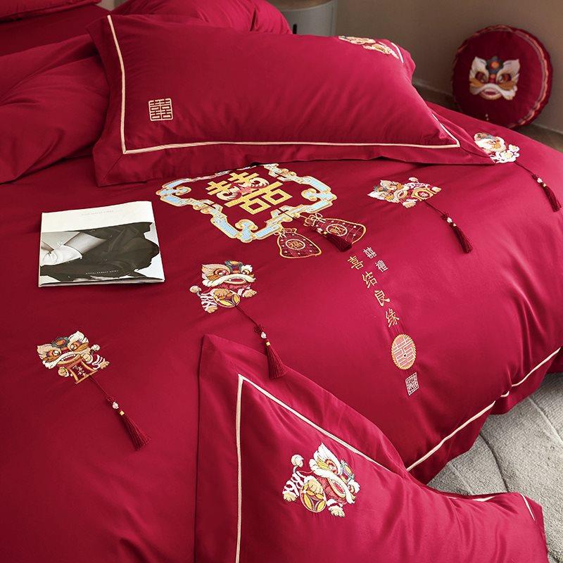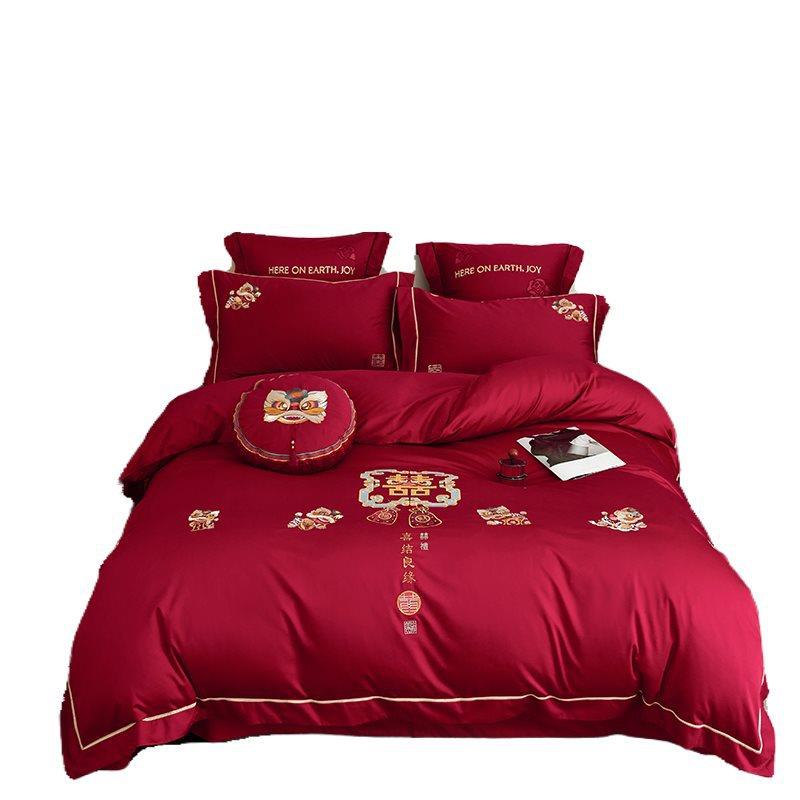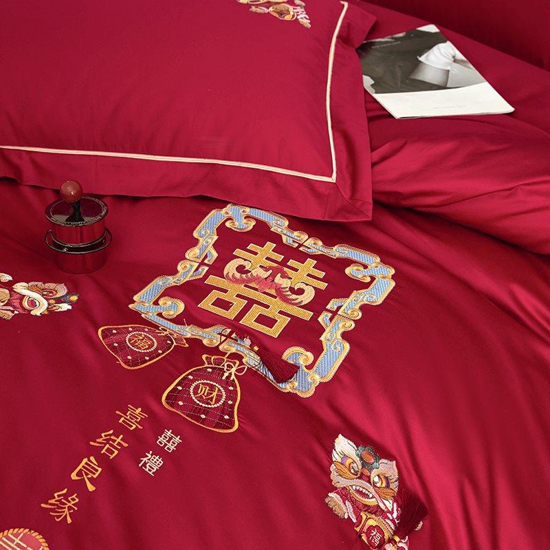 中式婚庆喜字刺绣100长绒棉四件套新婚陪嫁红色床单被套床上用品