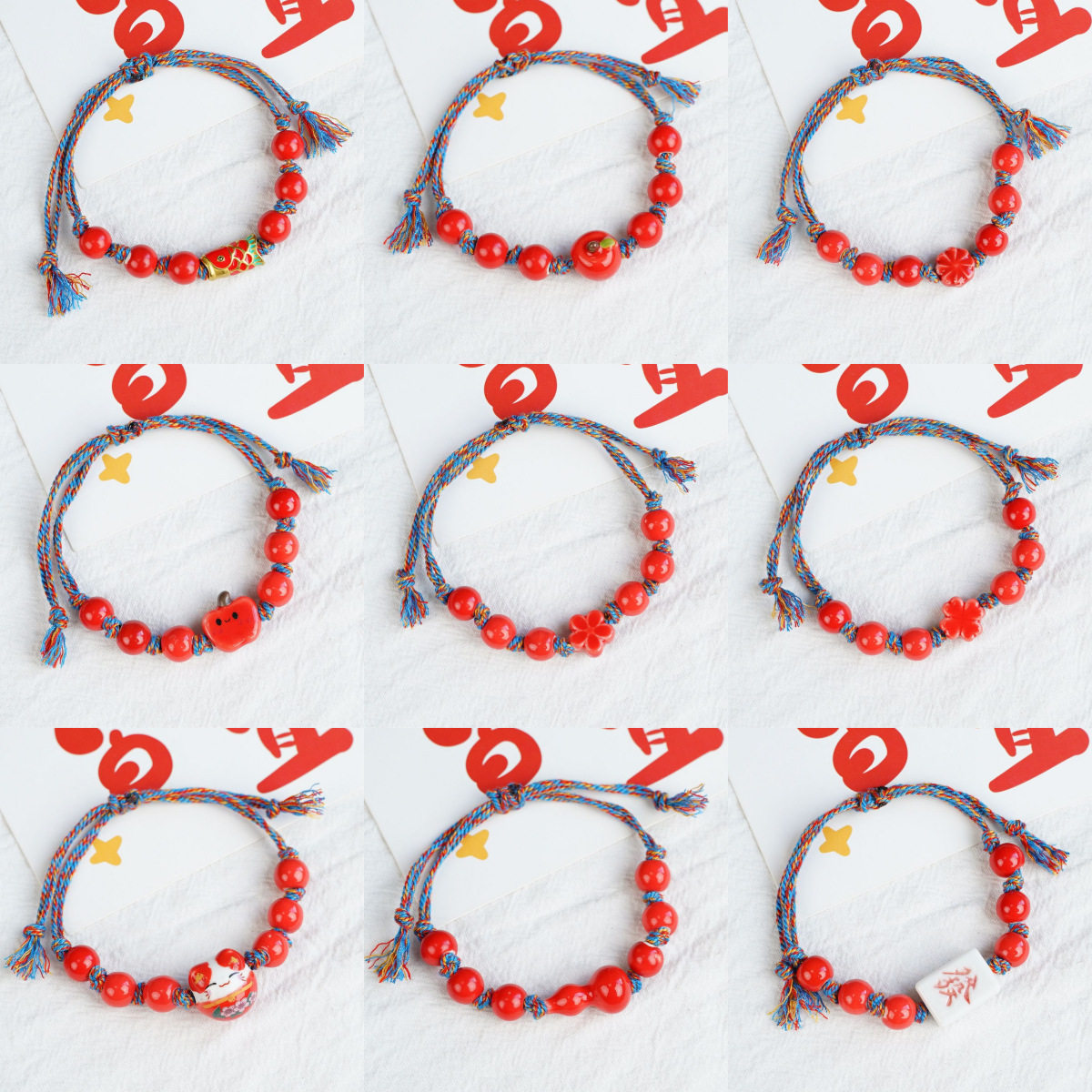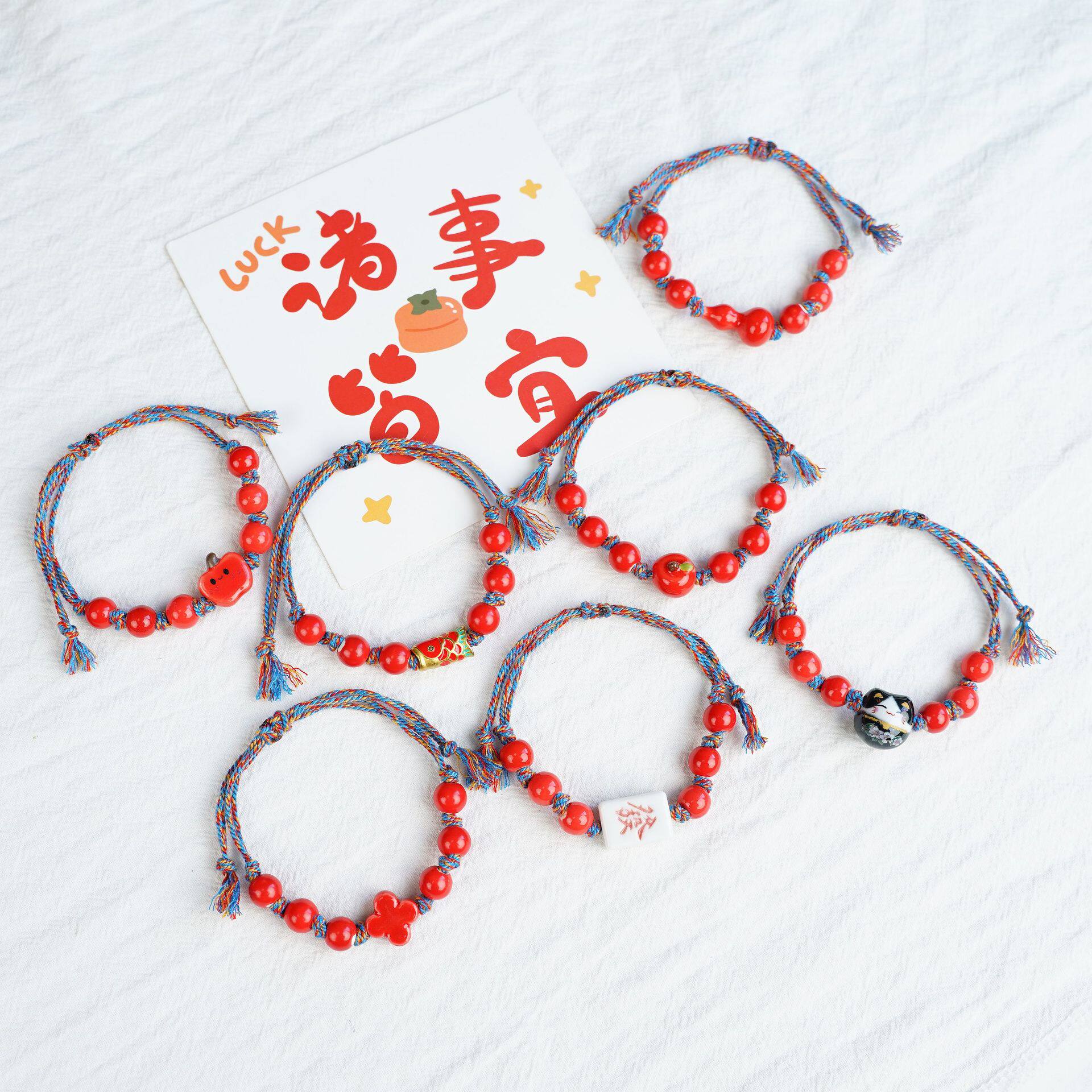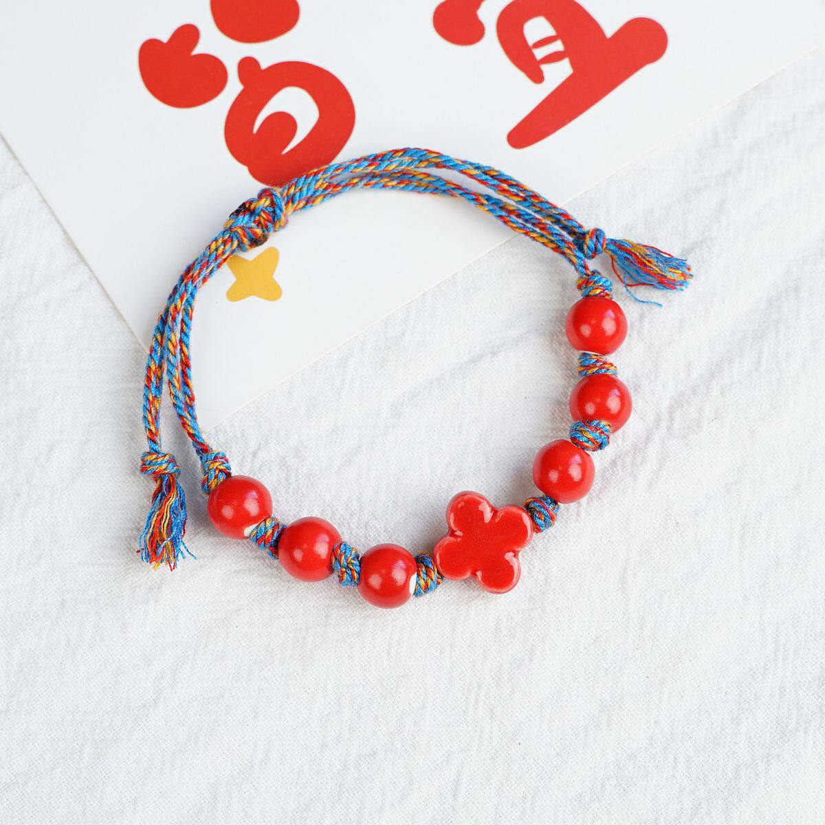 景德镇陶瓷新年祝福红色手链饰品摆摊小商品创意编织手串货源