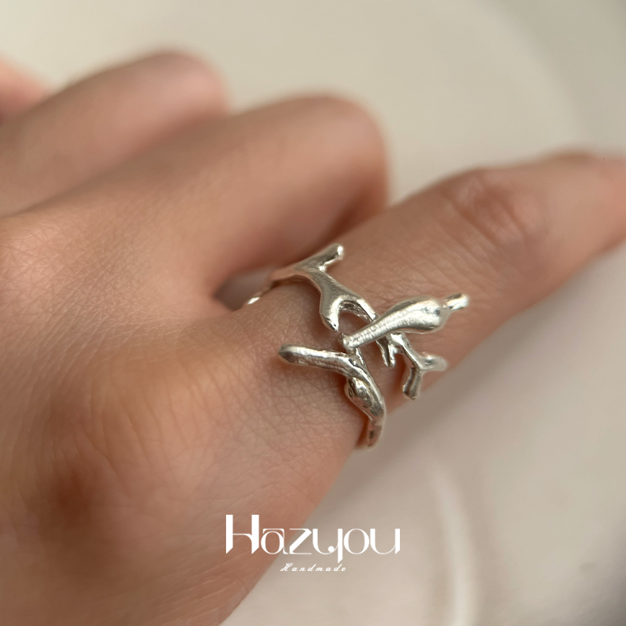 Hazyou原创小众设计S925/S990银树枝天然珍珠手工戒指组合女开口