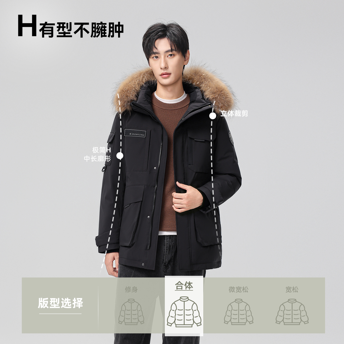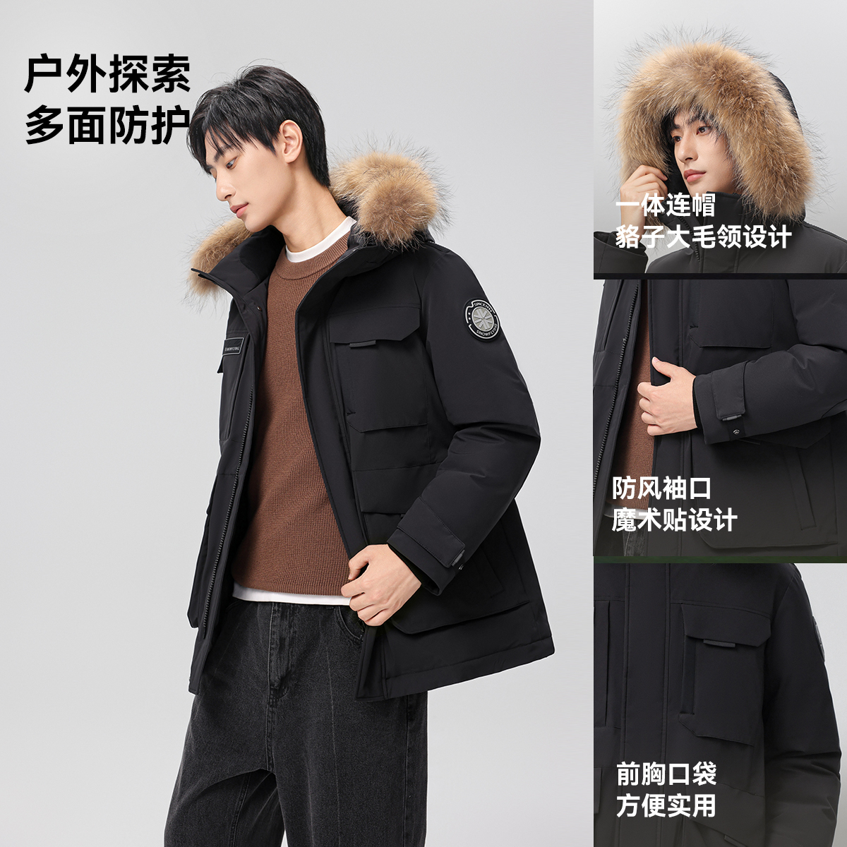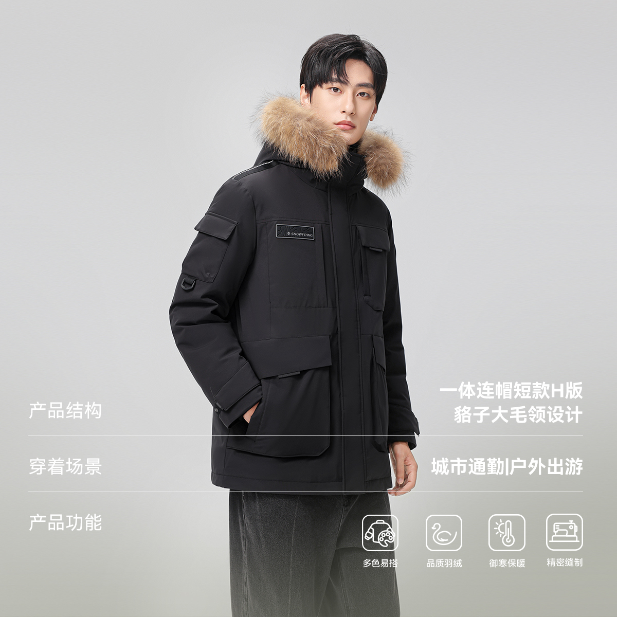 雪中飞2025男士短款工装派克连帽羽绒服大毛领保暖商务休闲舒适