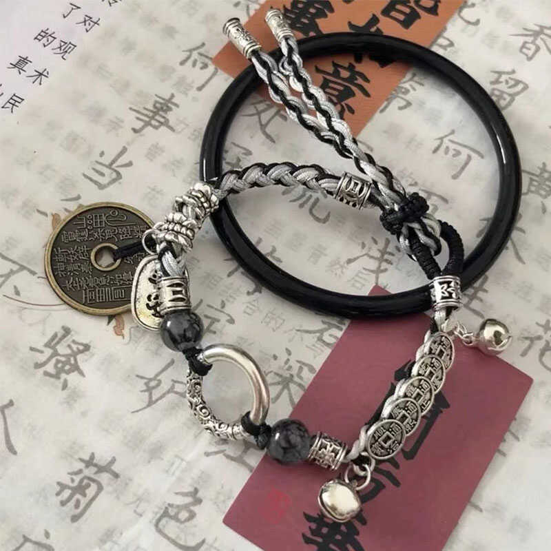 新中式编织绳手链女小众五帝钱山鬼钱手工手绳异域古风抽拉式手饰