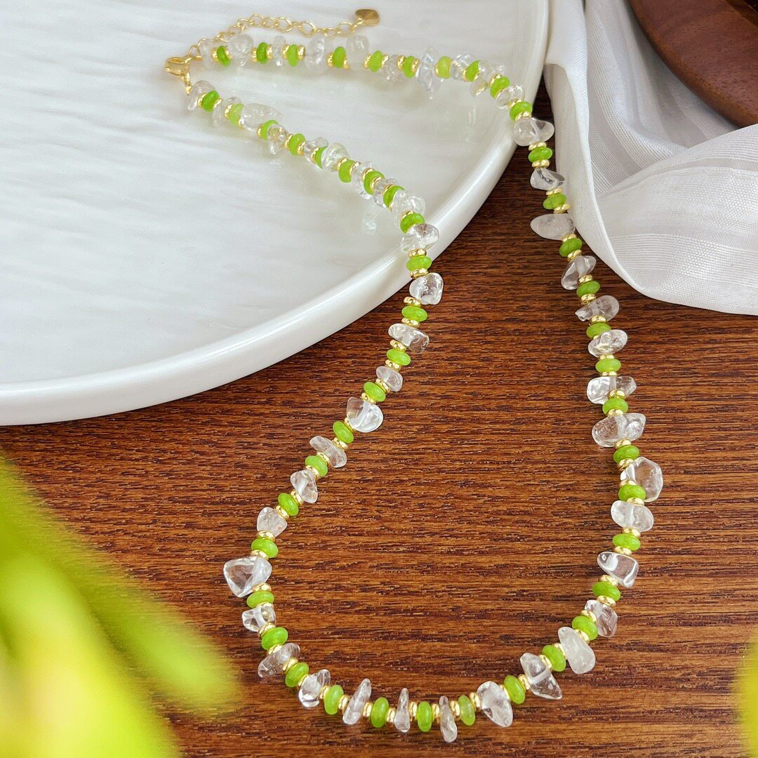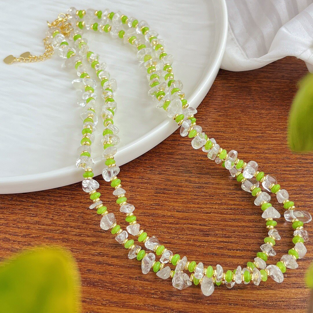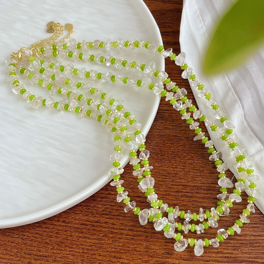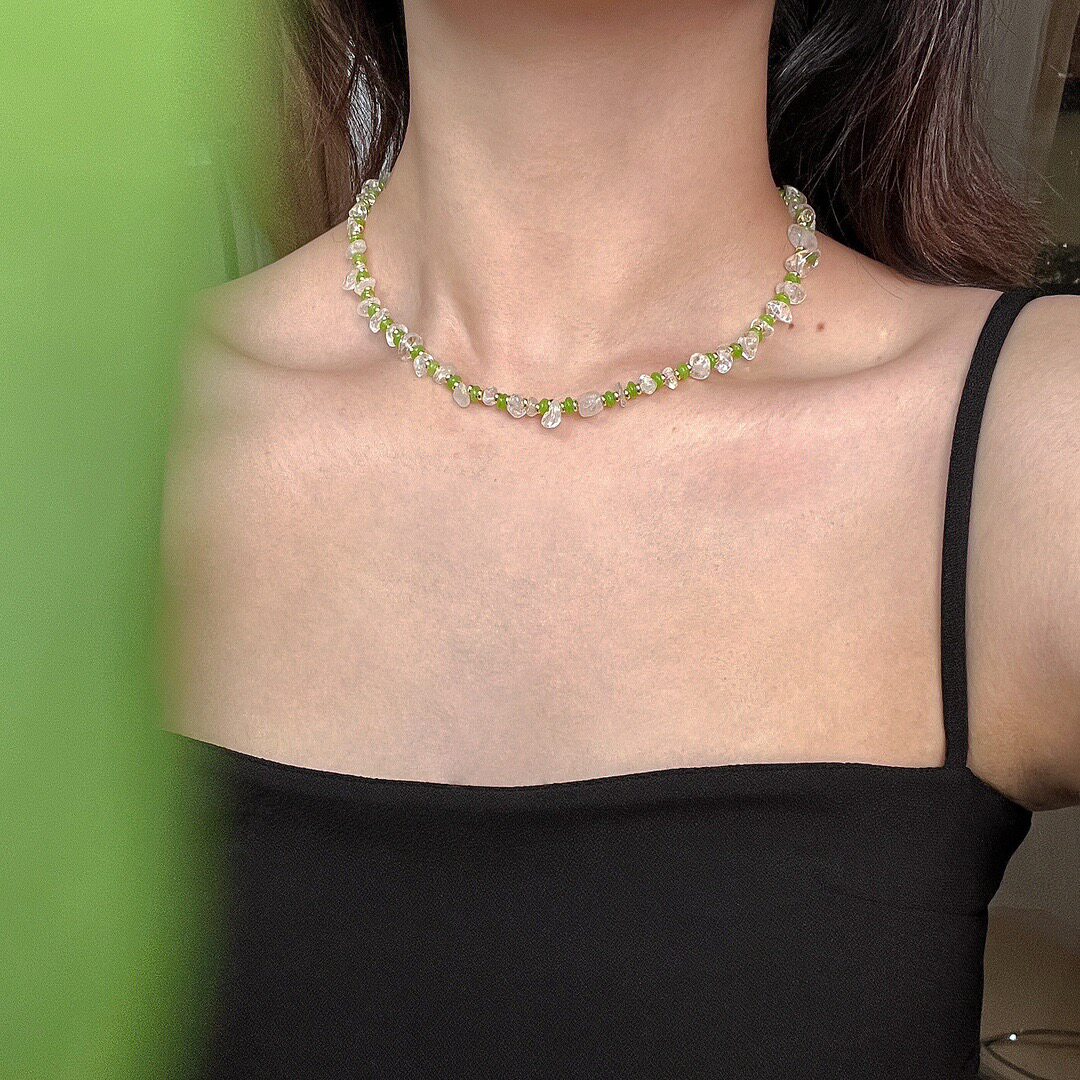 森系小清新绿色串珠项链 白水晶不规则碎石颈链 小众轻奢气质配饰