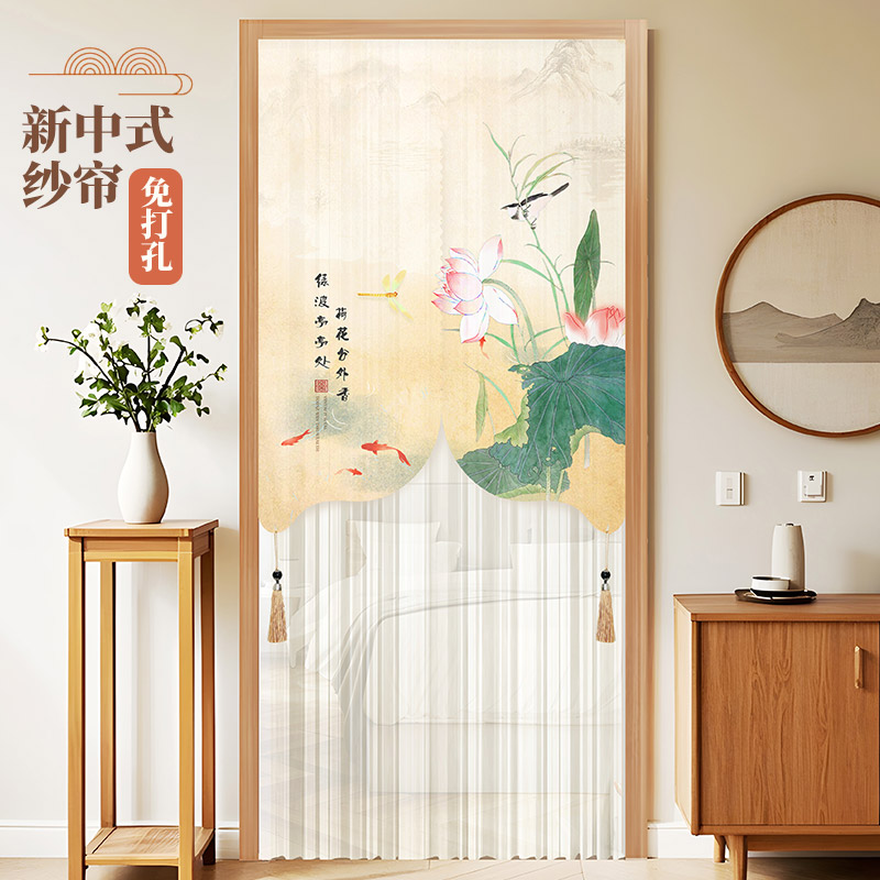 中式门帘四季隔断帘遮挡帘印花双纱帘装饰帘家用防蚊帘免打孔帘新