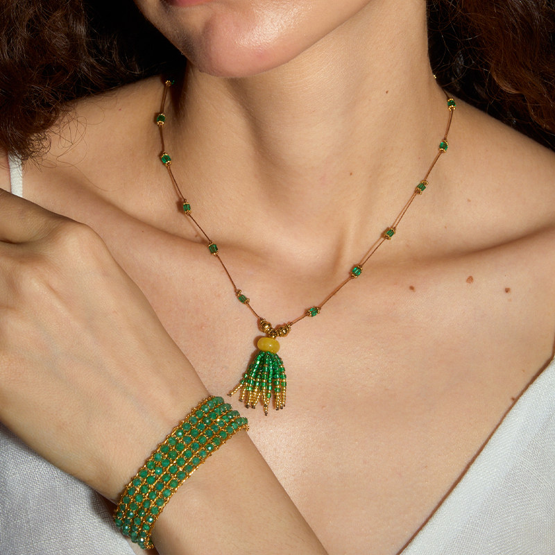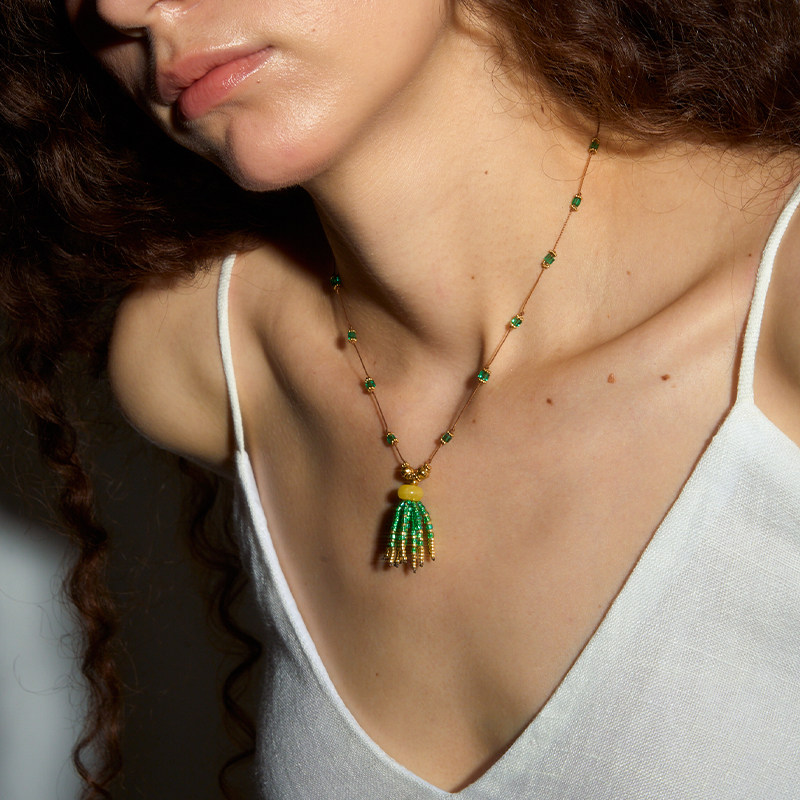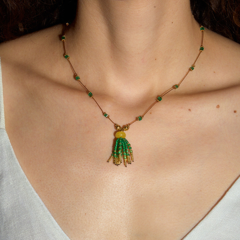 DINN DINN DESIGN绿色流苏串珠手工编织项链度假风复古锁骨链轻奢