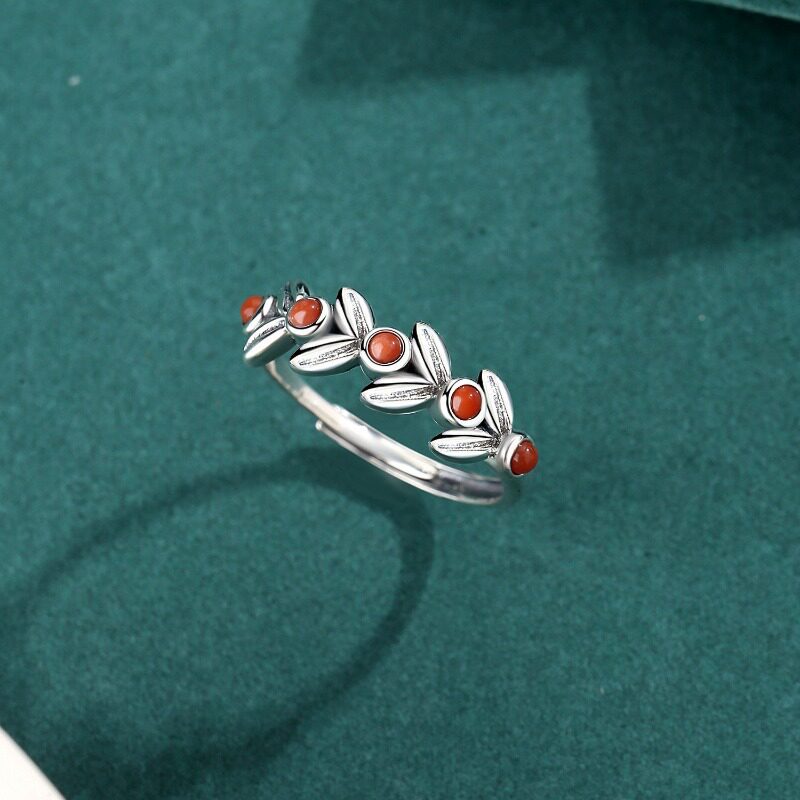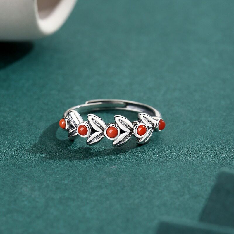 国风潮铜镀银手工饰品穗穗平安南红色麦穗幸运花环戒指开口环圈礼