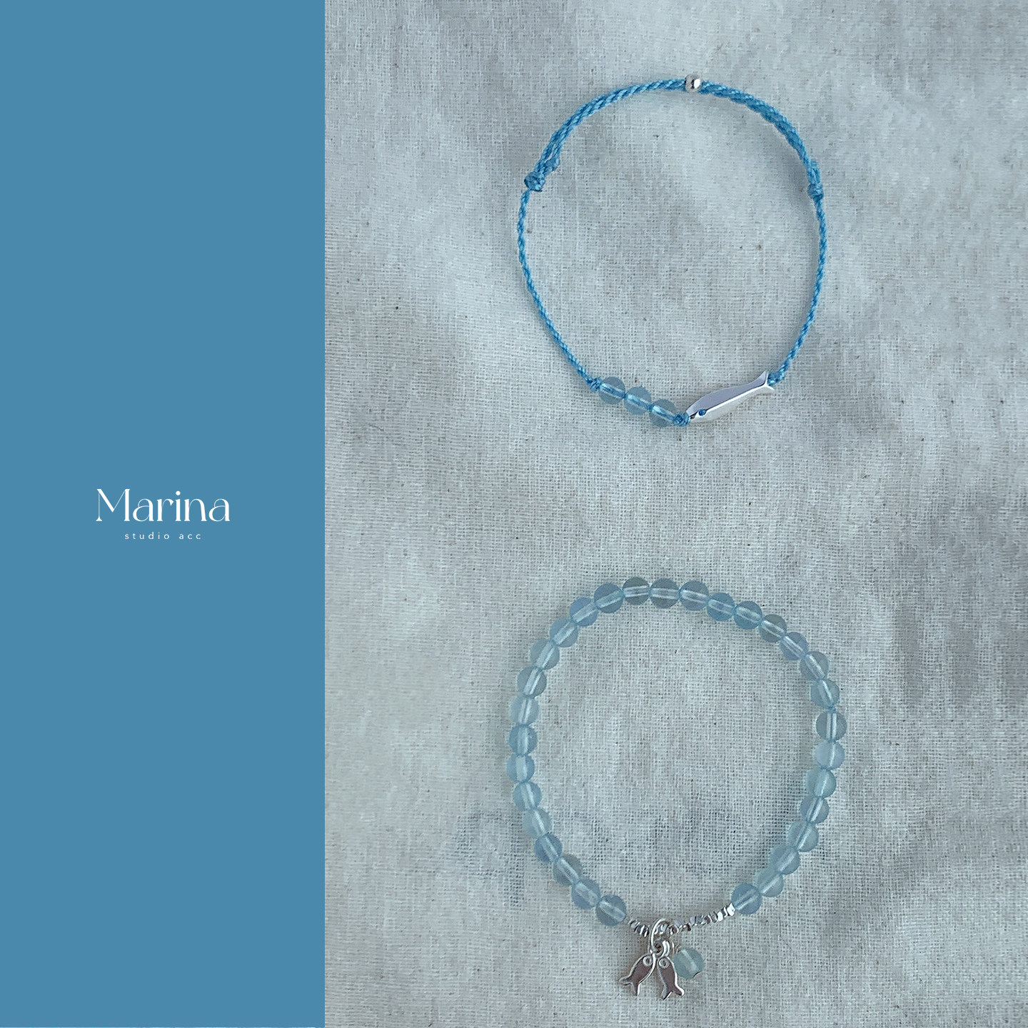 蓝色锦鲤手绳|天然海蓝宝手作串珠叠戴手链 通体s925纯银手串女