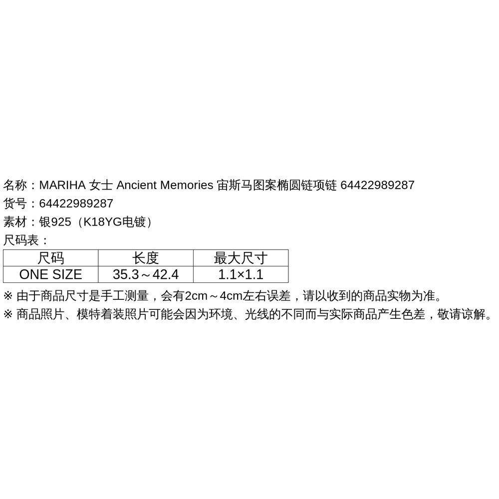 日本直邮MARIHA 女士 Ancient Memories 宙斯马图案椭圆链项链 64