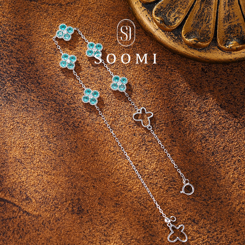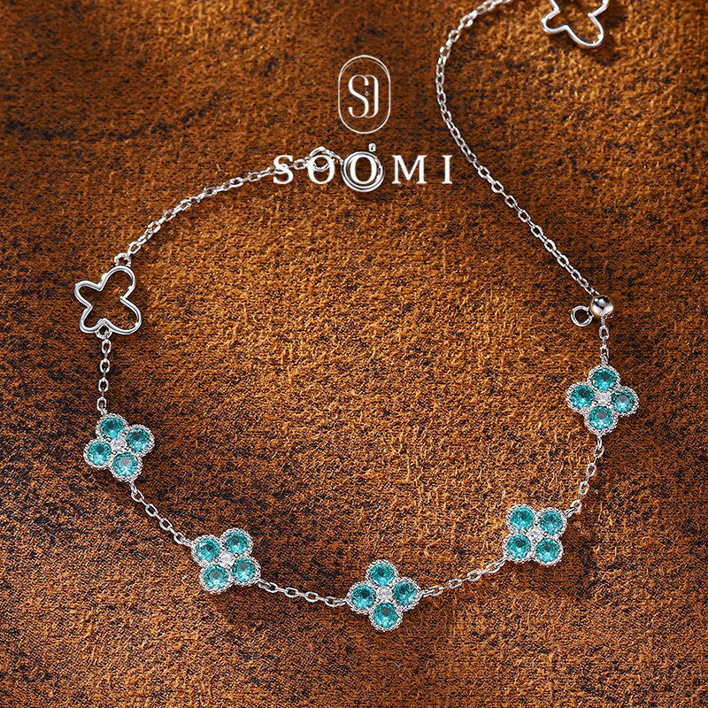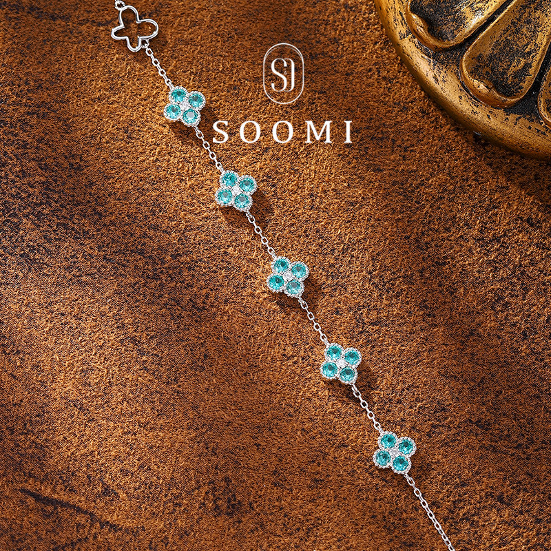 【SOOMI五花报福】帕拉伊巴手链培育蓝宝石925纯银四叶草精致设计