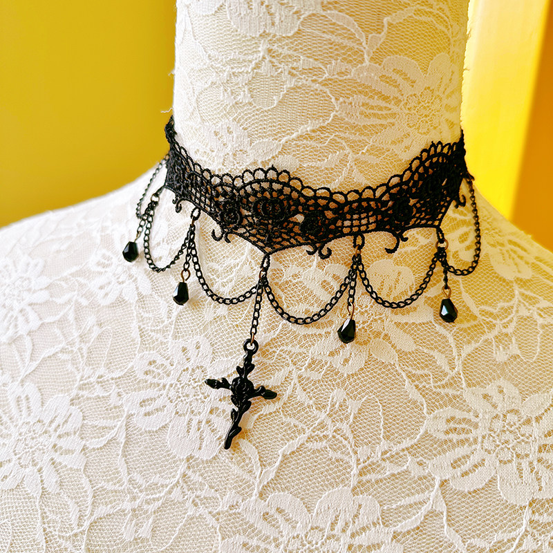 复古哥特风颈圈饰品黑色蕾丝珍珠吊坠小众项链女锁骨链LSXL015