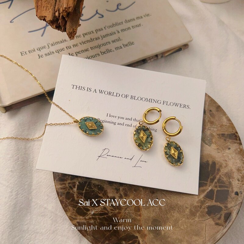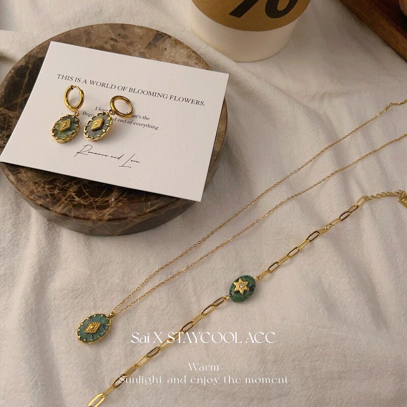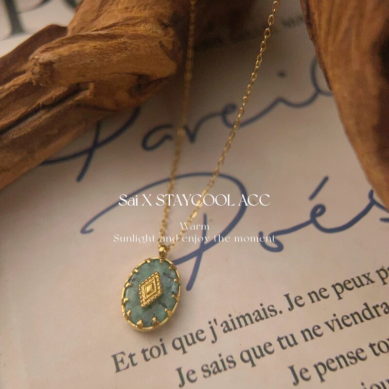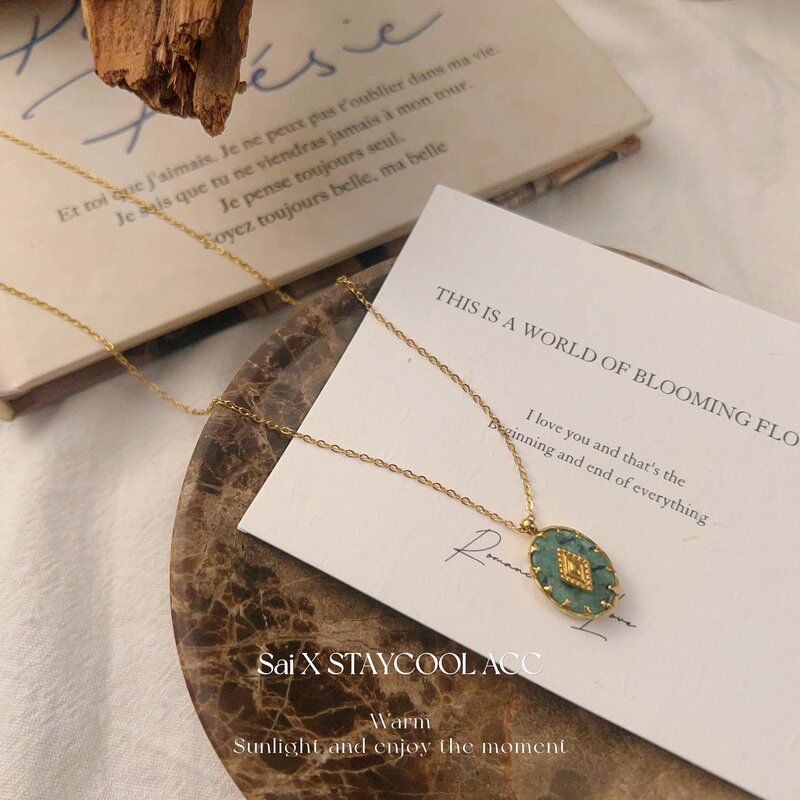 北欧风松绿色石女士项链钛钢高级感复古锁骨链时髦欧美