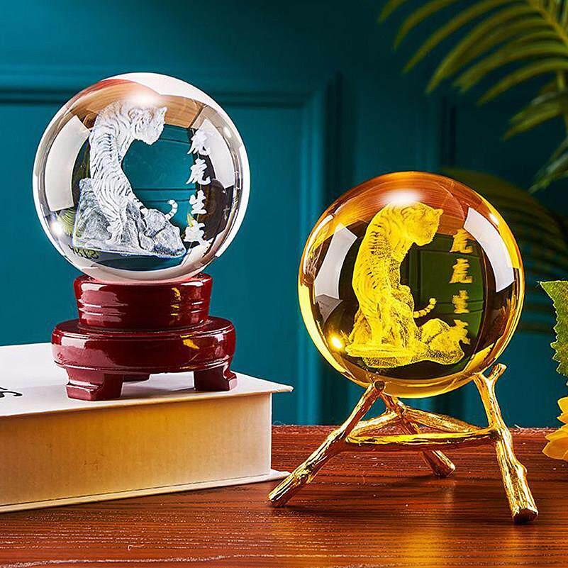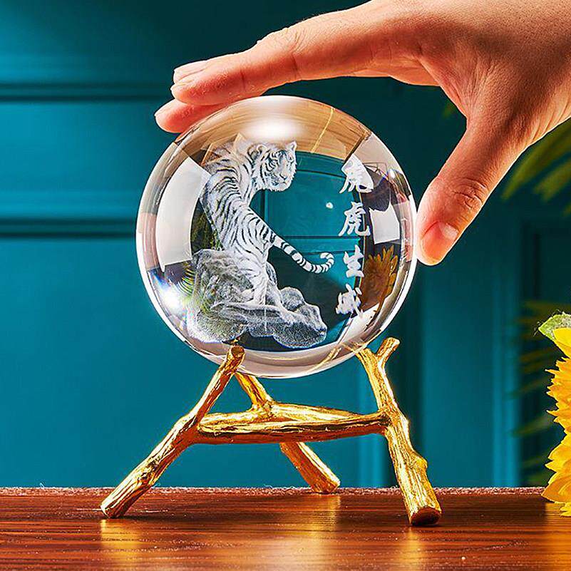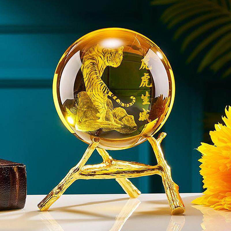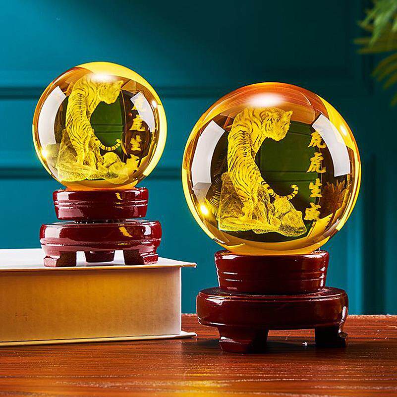 黄色水晶球虎虎生威高档轻奢大气水晶球办公室摆件装饰摆设工艺礼