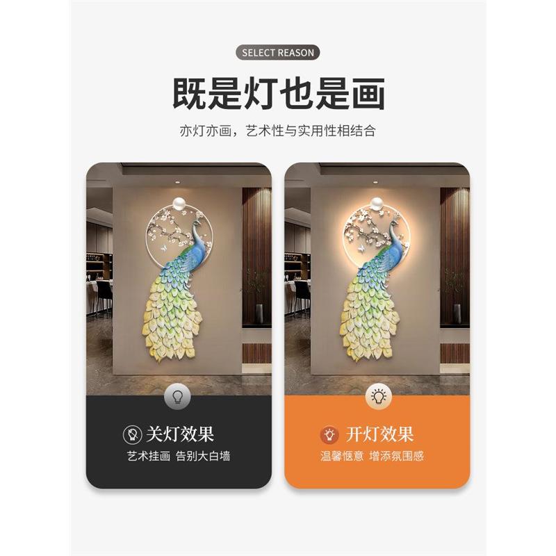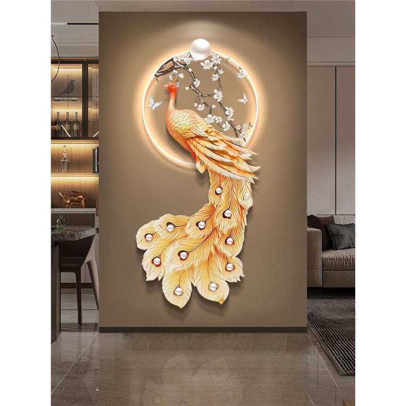 新中式孔雀玄关装饰画轻奢入户带led灯发光壁画客厅走廊过道挂画