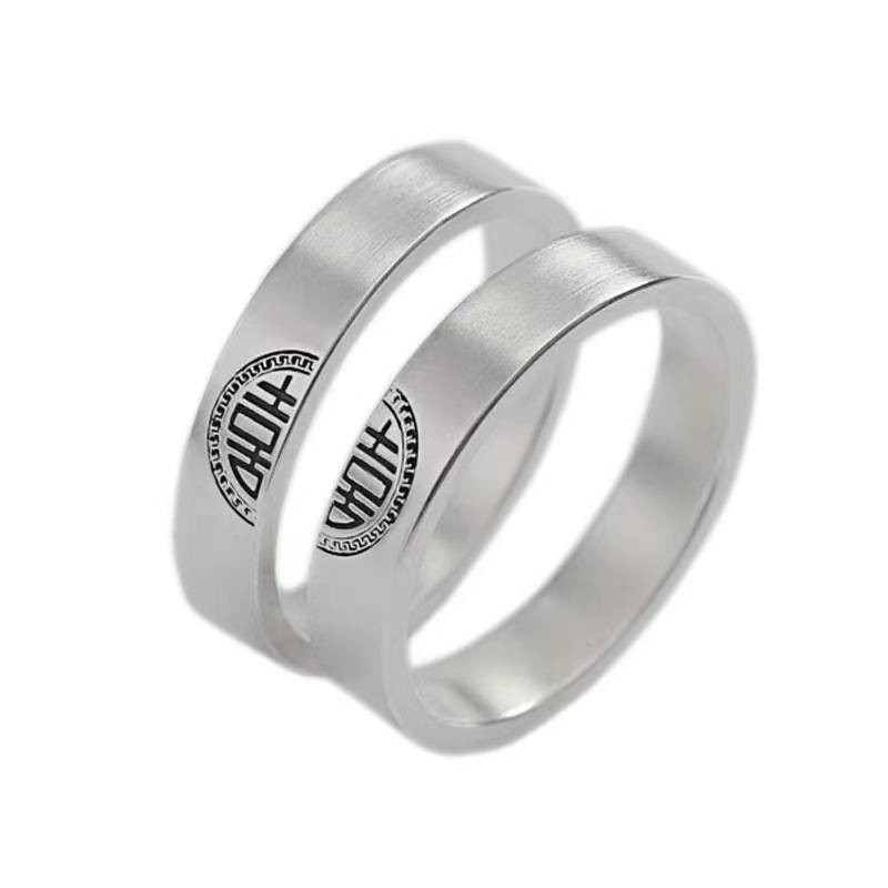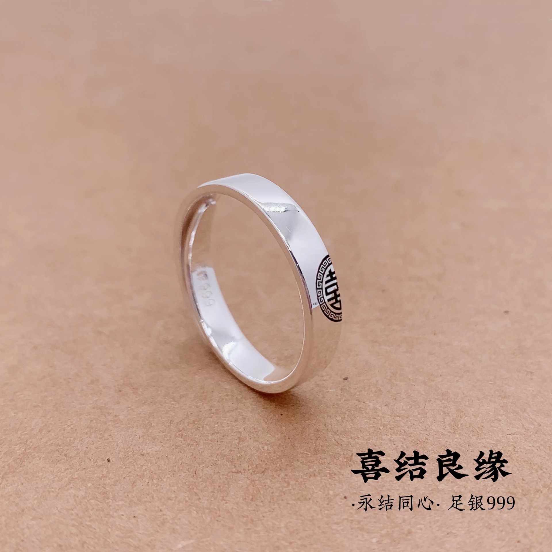 福氏足银999纯银情侣双喜中式对戒磨砂银戒指素圈开口戒指喜字