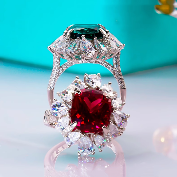 PT950铂金D色莫桑石奢华满钻红宝石钻戒复古轻奢绿钻戒指时尚精致