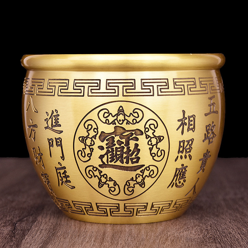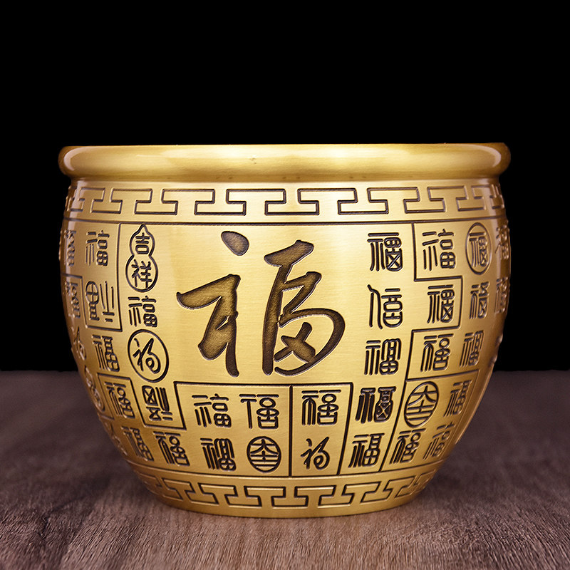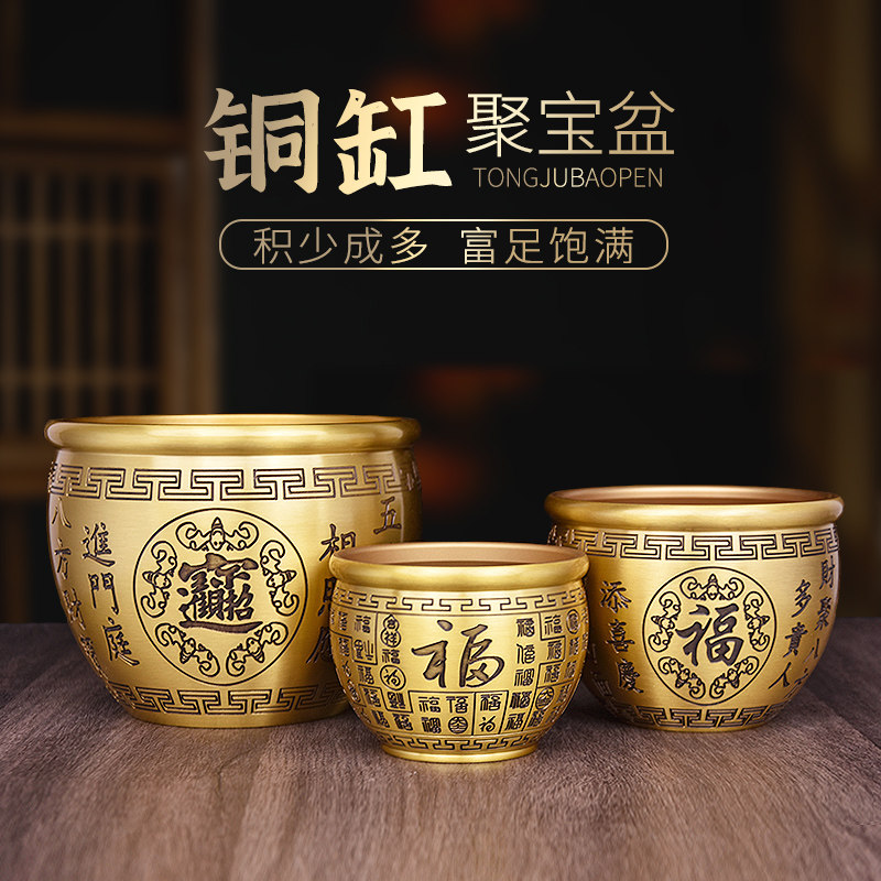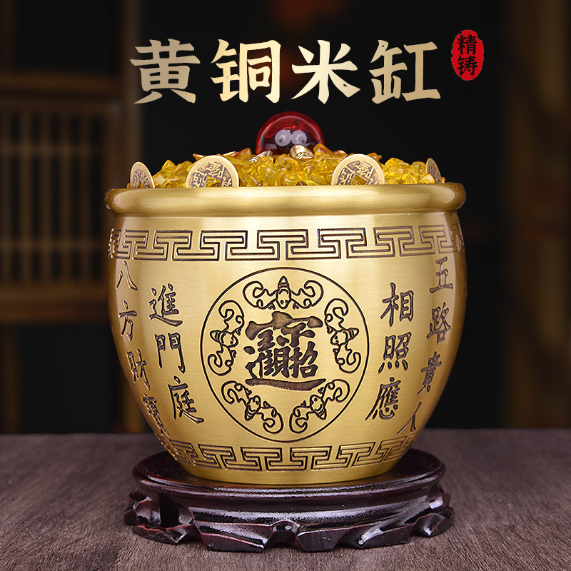 百福铜缸摆件聚宝盆纯黄铜米缸大小号存钱罐客厅办公室桌面装饰品