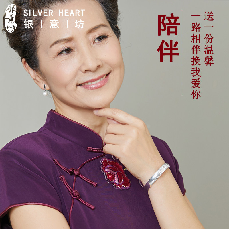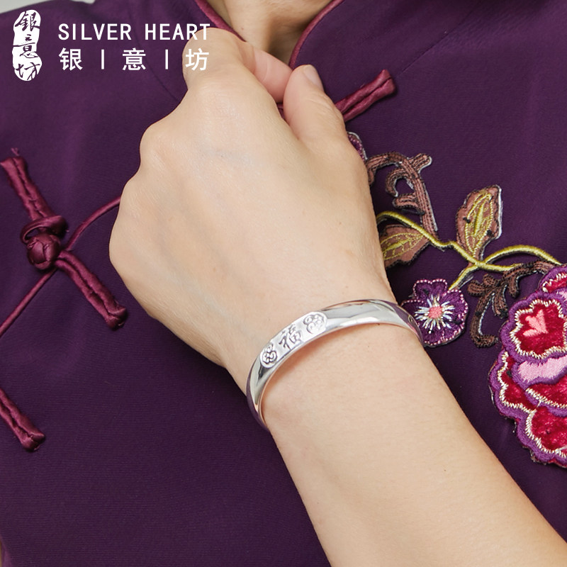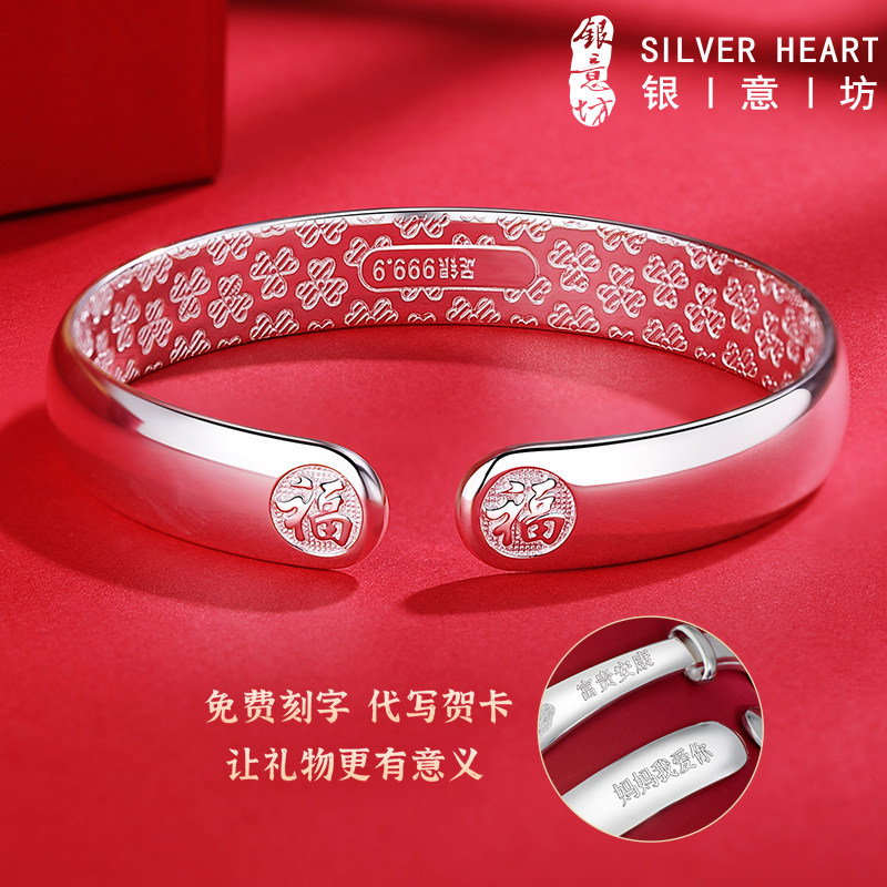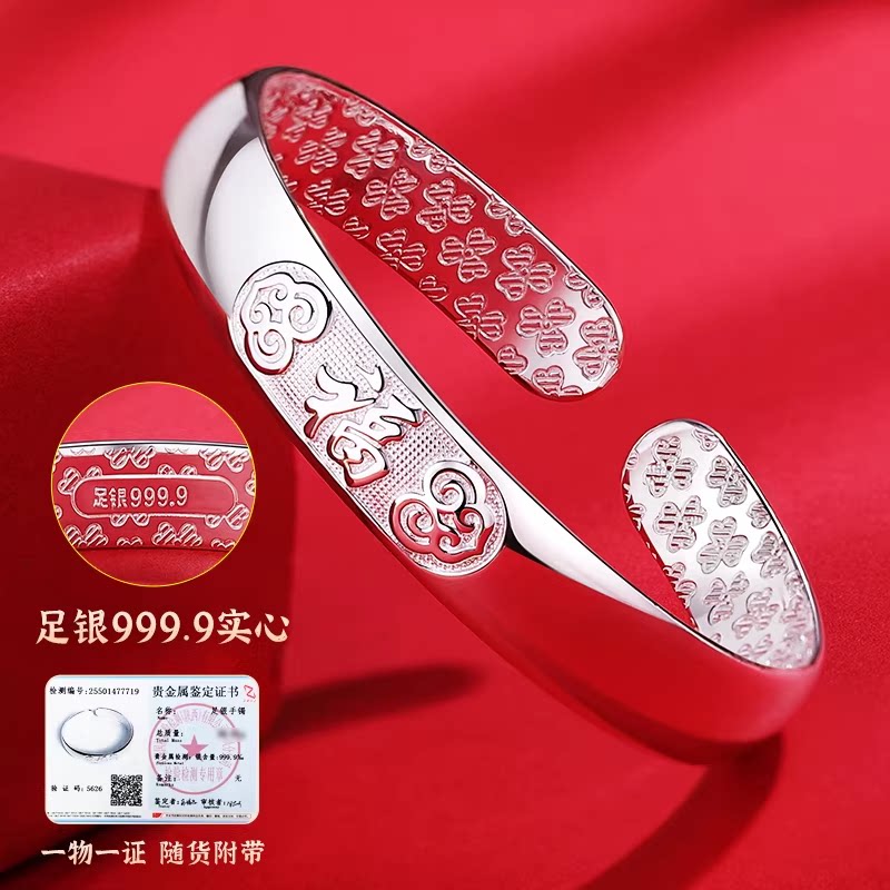 百福大宽银手镯9999纯银老人款奶奶实心开口银镯子生日礼物送妈妈