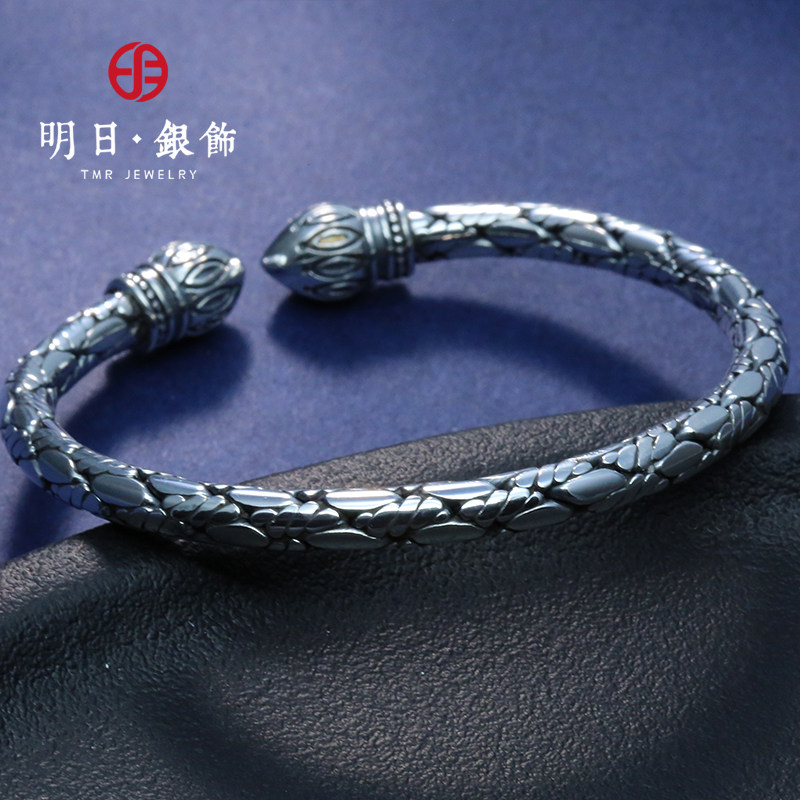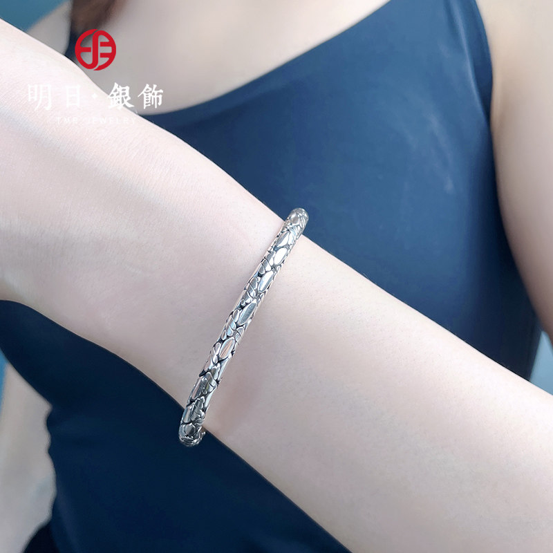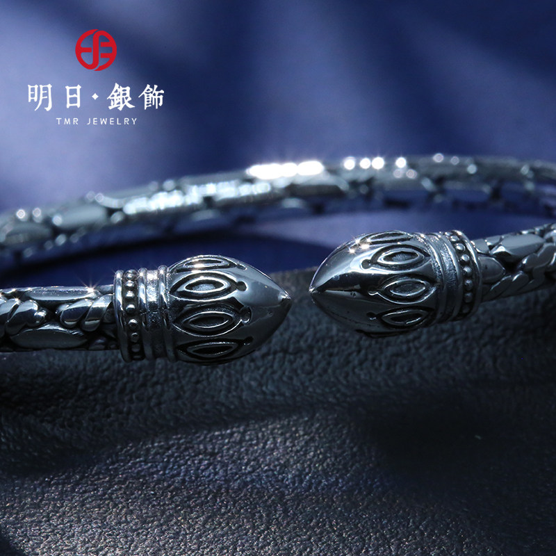 明日足银999男士扭麻编织对口实心纯银手镯复古个性潮