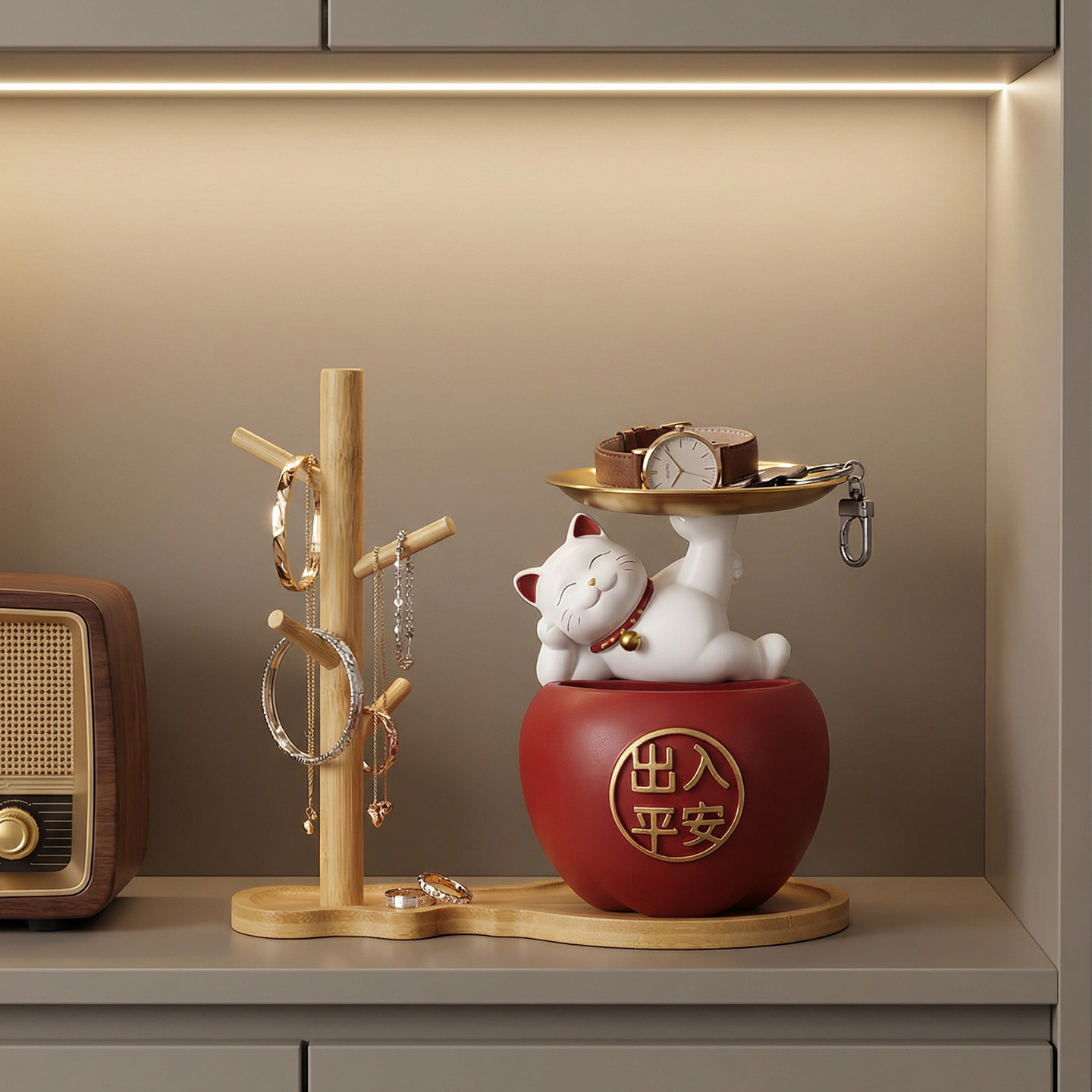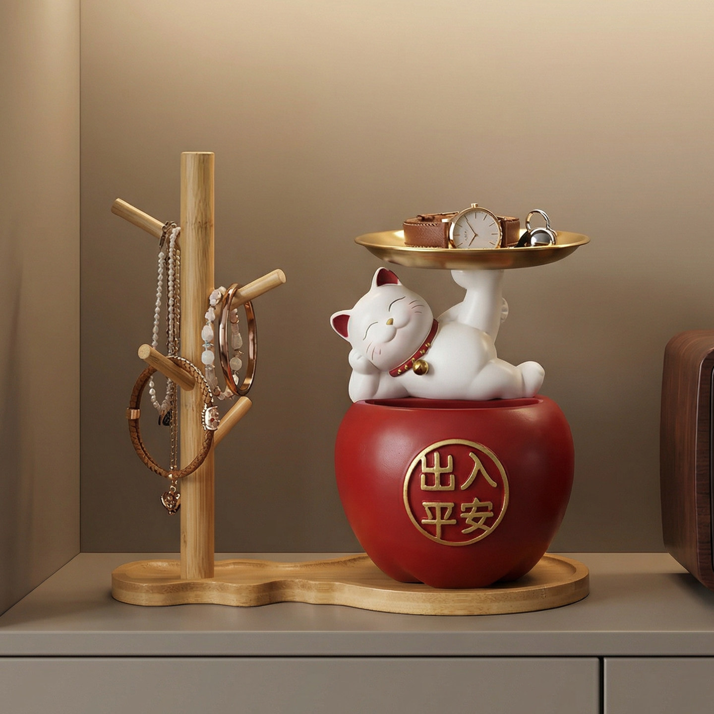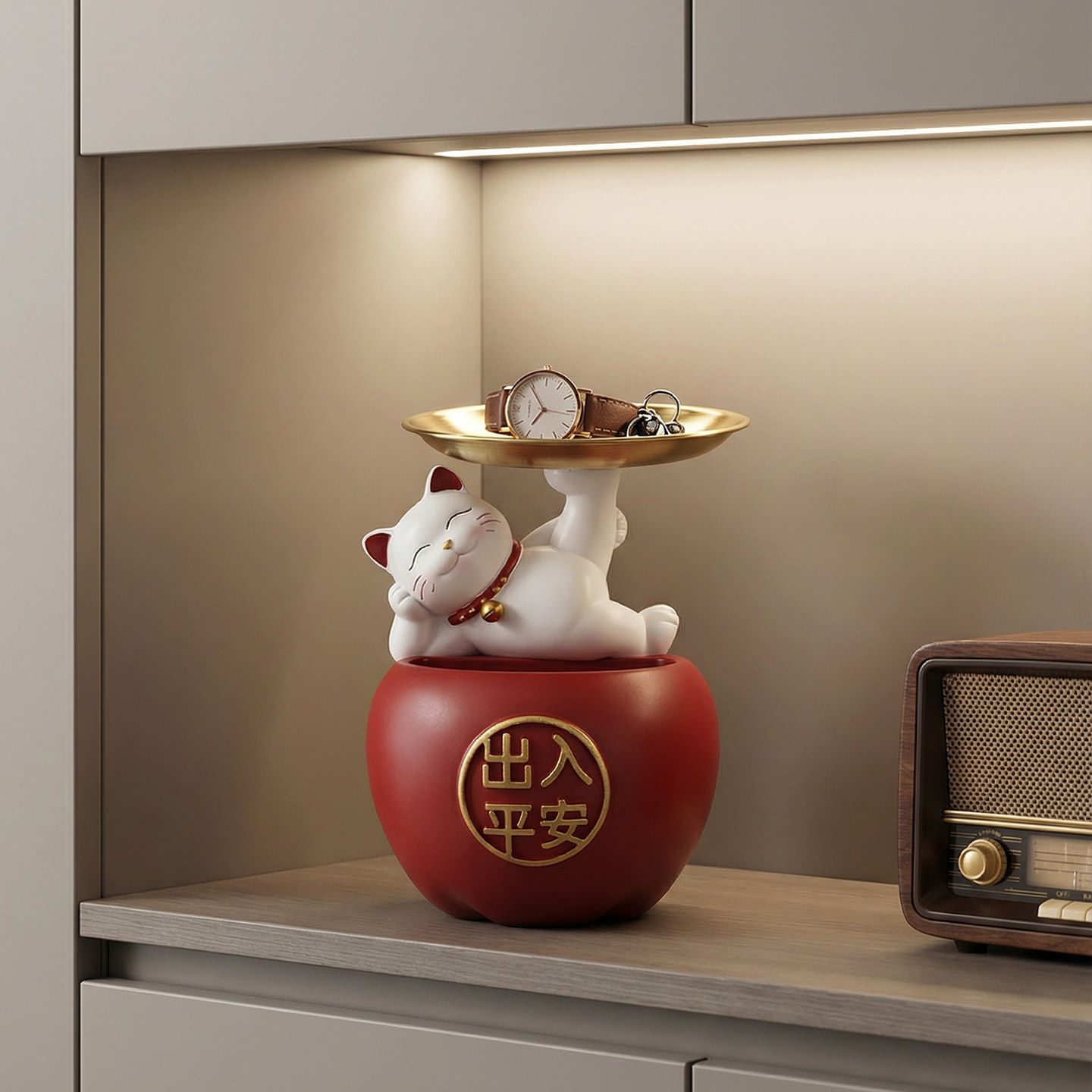 入户门招财猫托盘放钥匙玄关柜收纳摆件鞋柜装饰新房喜庆红色苹果