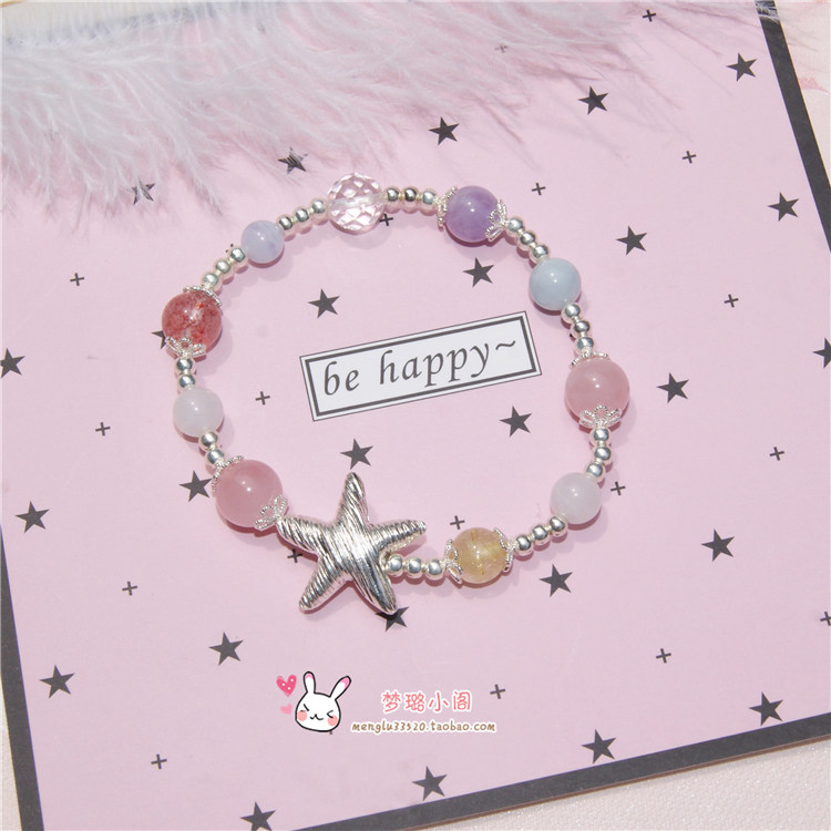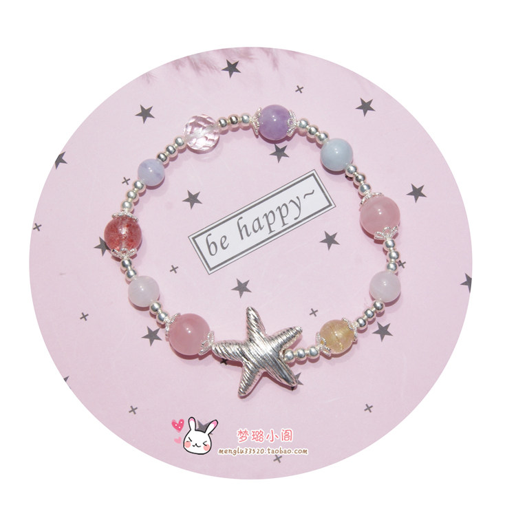 天然水晶手链S925大海星纯银饰草莓晶粉晶黄发晶海蓝宝白水晶等