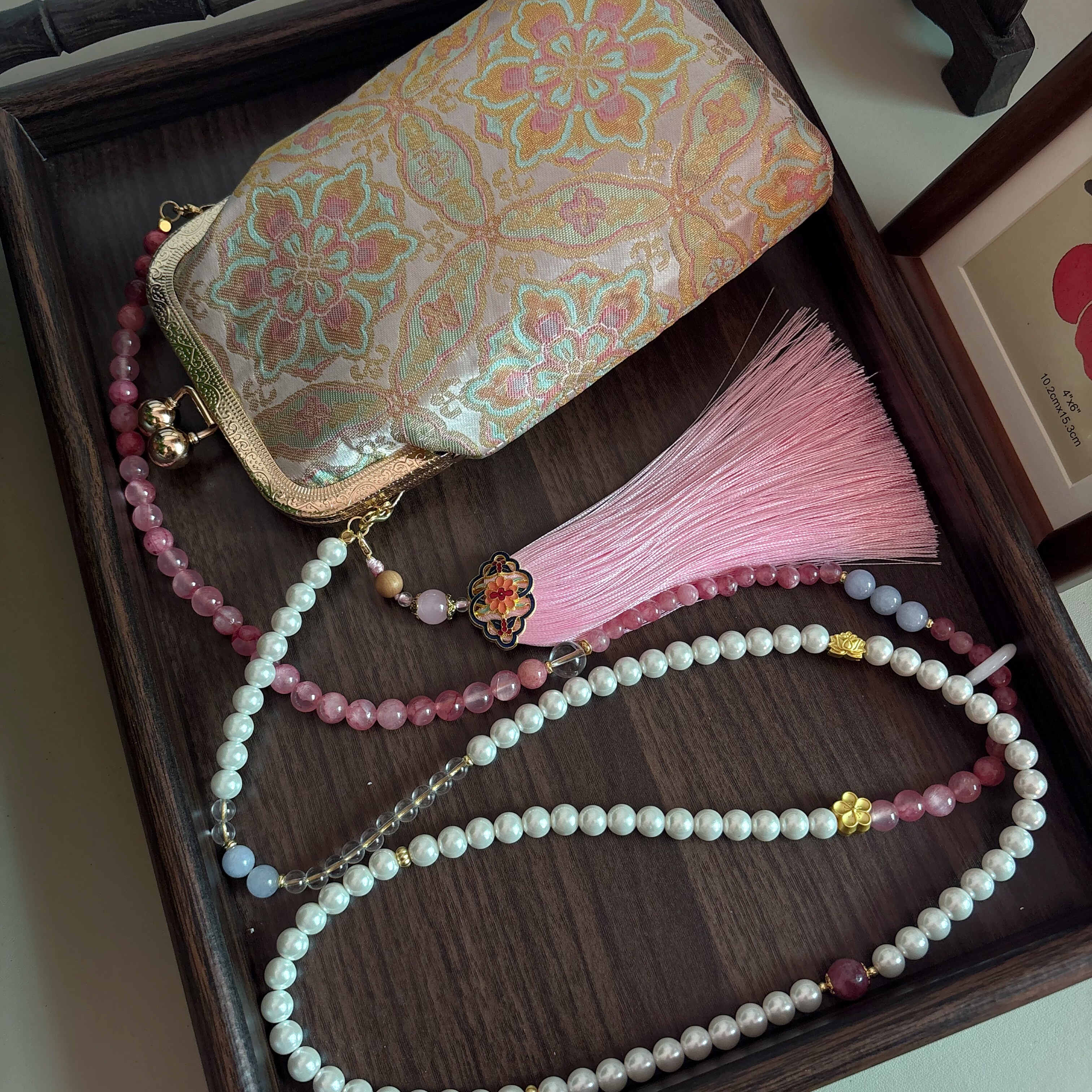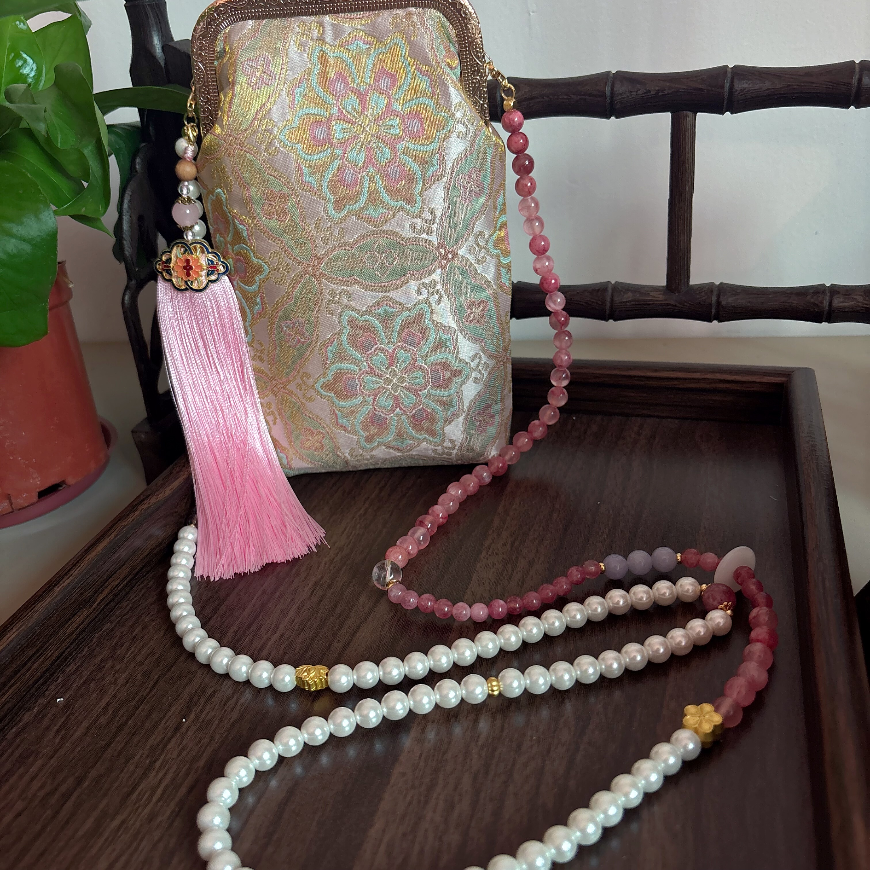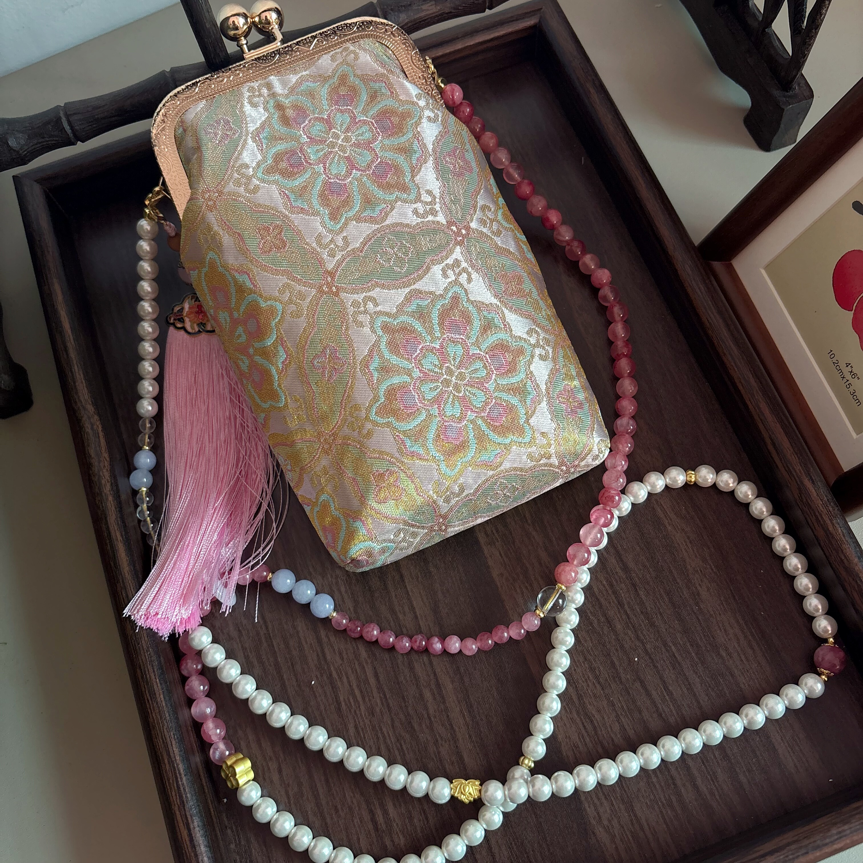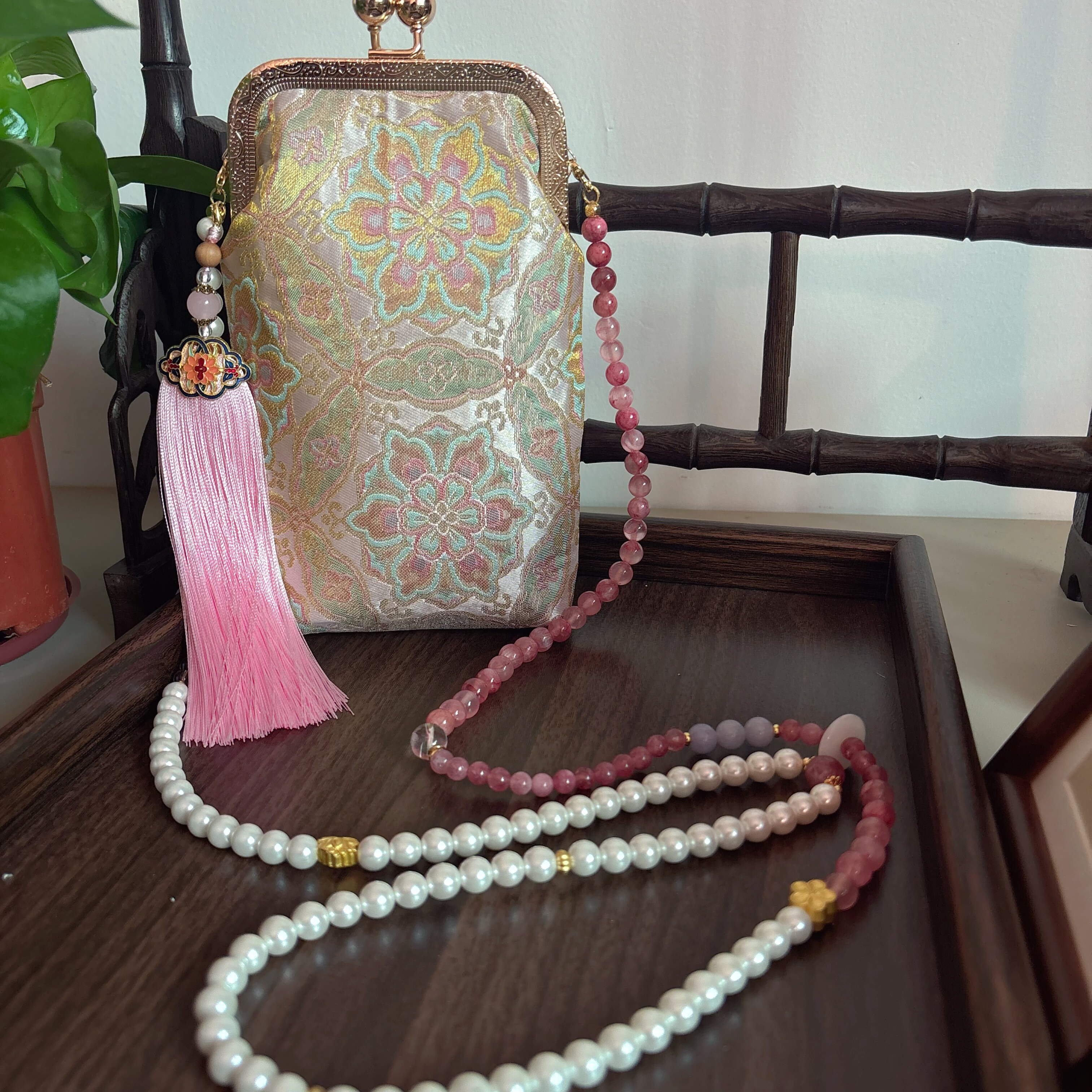 新中式国风纹样手机包古风汉服出行斜挎珍珠链条包包高级粉斜挎包