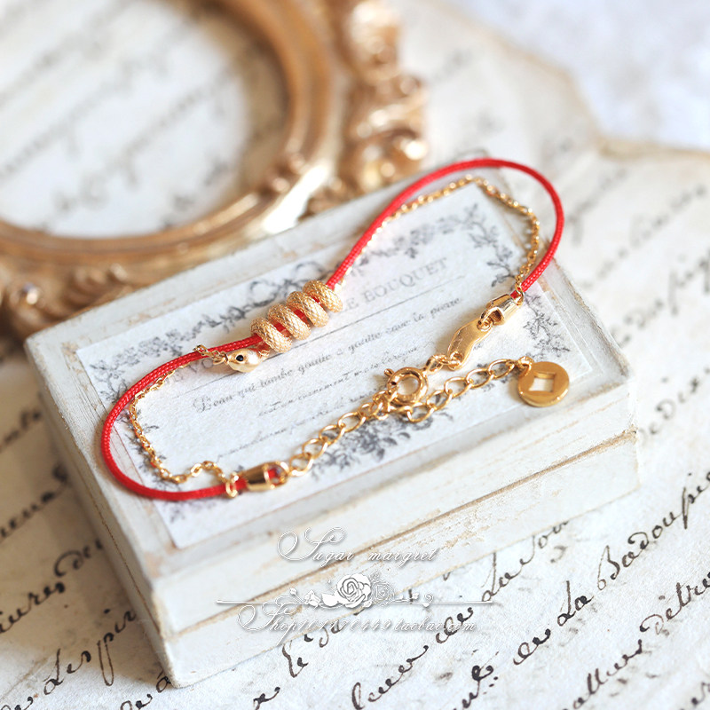 灵蛇金运 本命年灵蛇系列重工925纯银镀金超精致红绳手链 项链