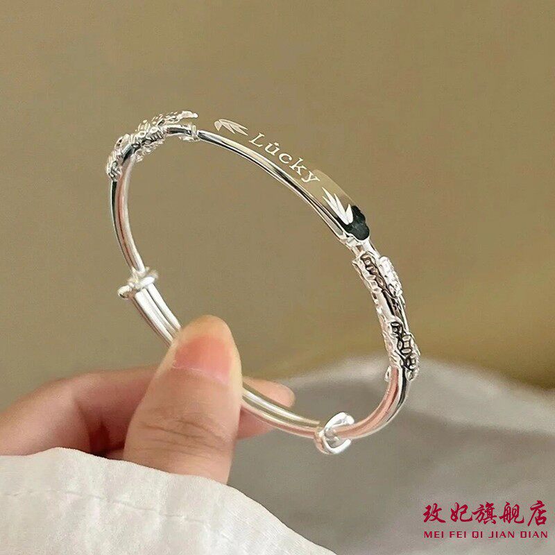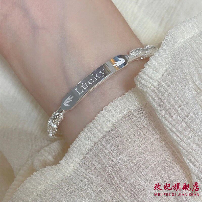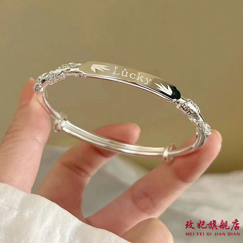 香港正生足银S9999浮雕花丝Lucky幸运纯银手镯手环送女友闺蜜礼物