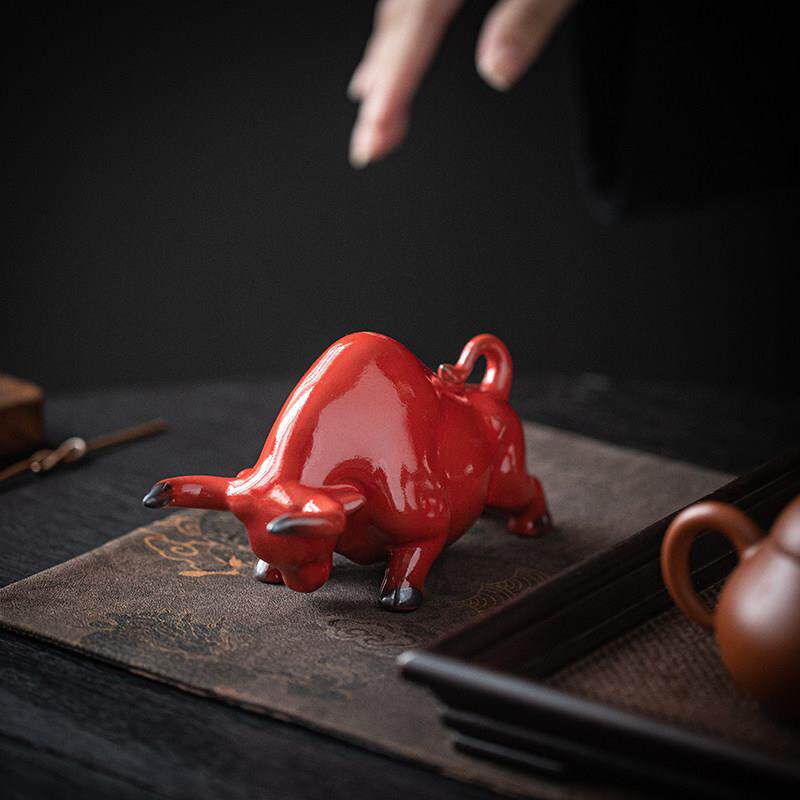股票吉祥物牛气冲天陶瓷红色牛摆件招财家居客厅博古风水架装饰品