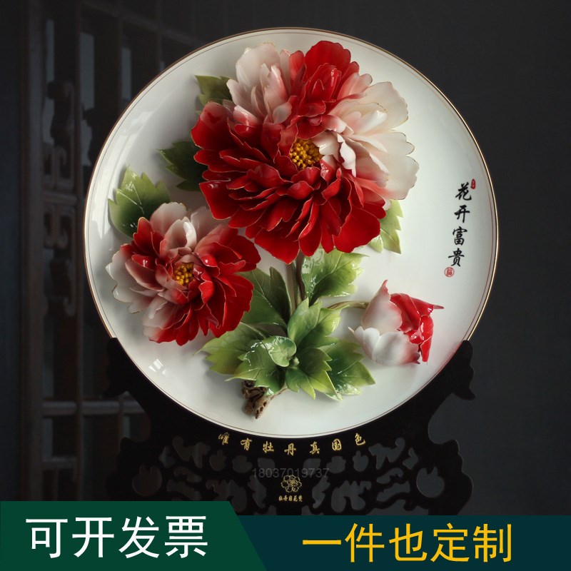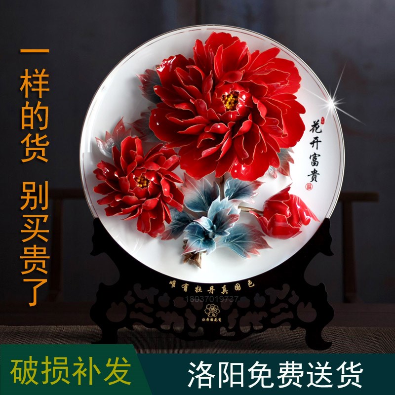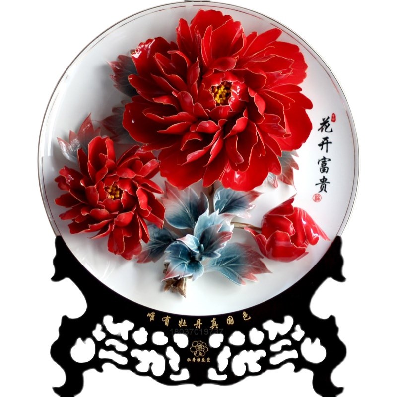 牡丹瓷盘摆件乔迁商务工艺品礼品挂盘透光骨瓷描金边牡丹花瓷盘