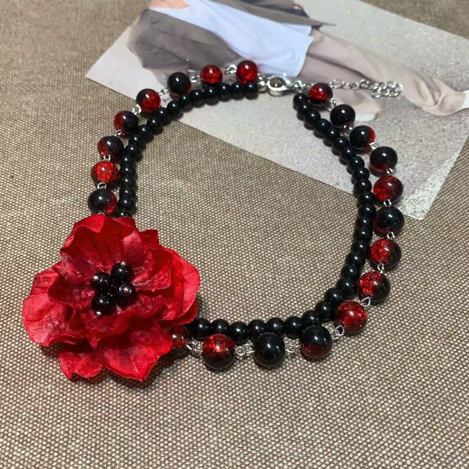 复古vintage亚文化红色花朵宝石串珠项链choke小众百搭气质锁骨链