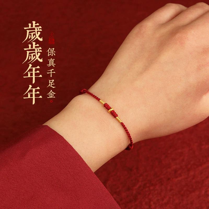 普陀山黄金红绳手链女蛇年本命年编织脚链平安扣足金手绳情侣礼物