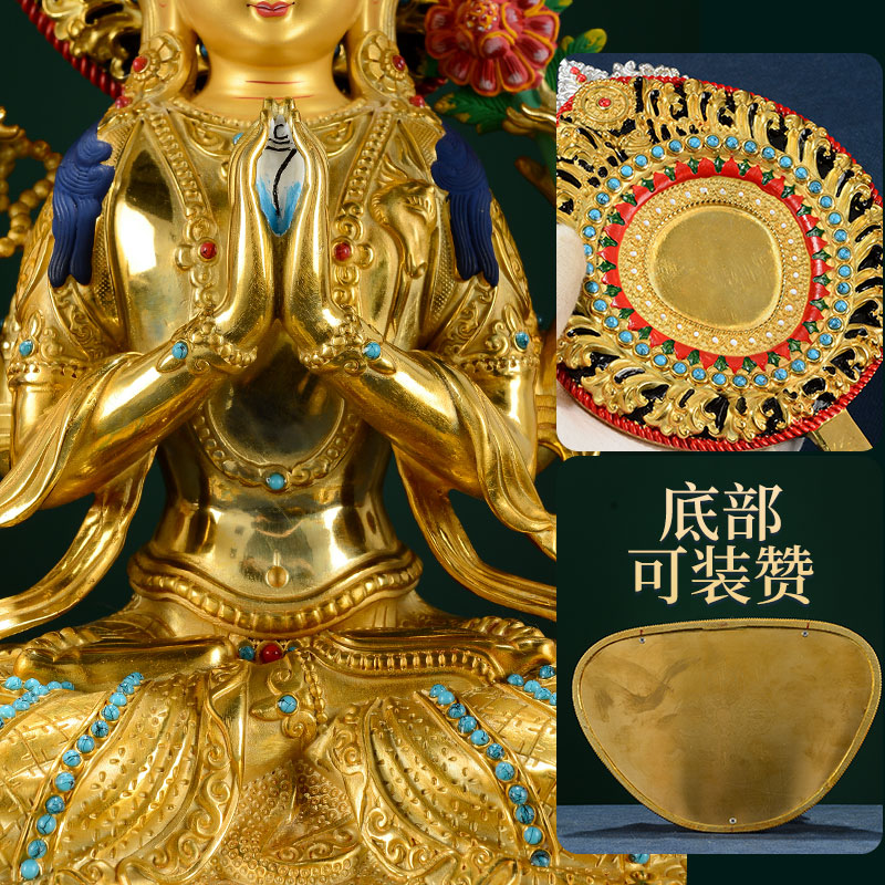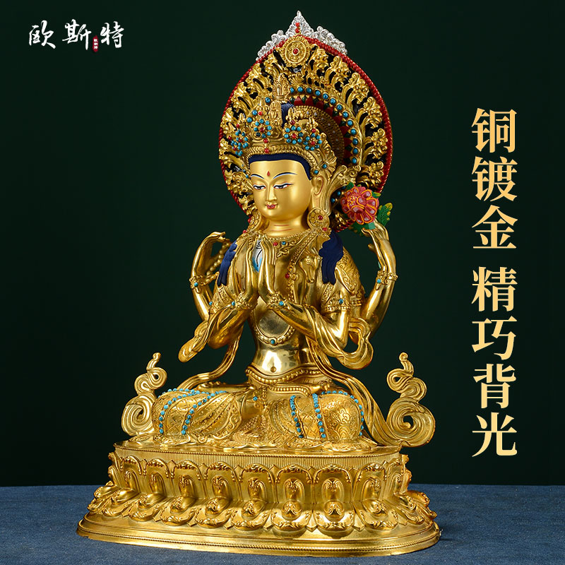 四臂观音铜像摆件 西藏全铜镀金雕花家居客厅玄关观音菩萨像11寸