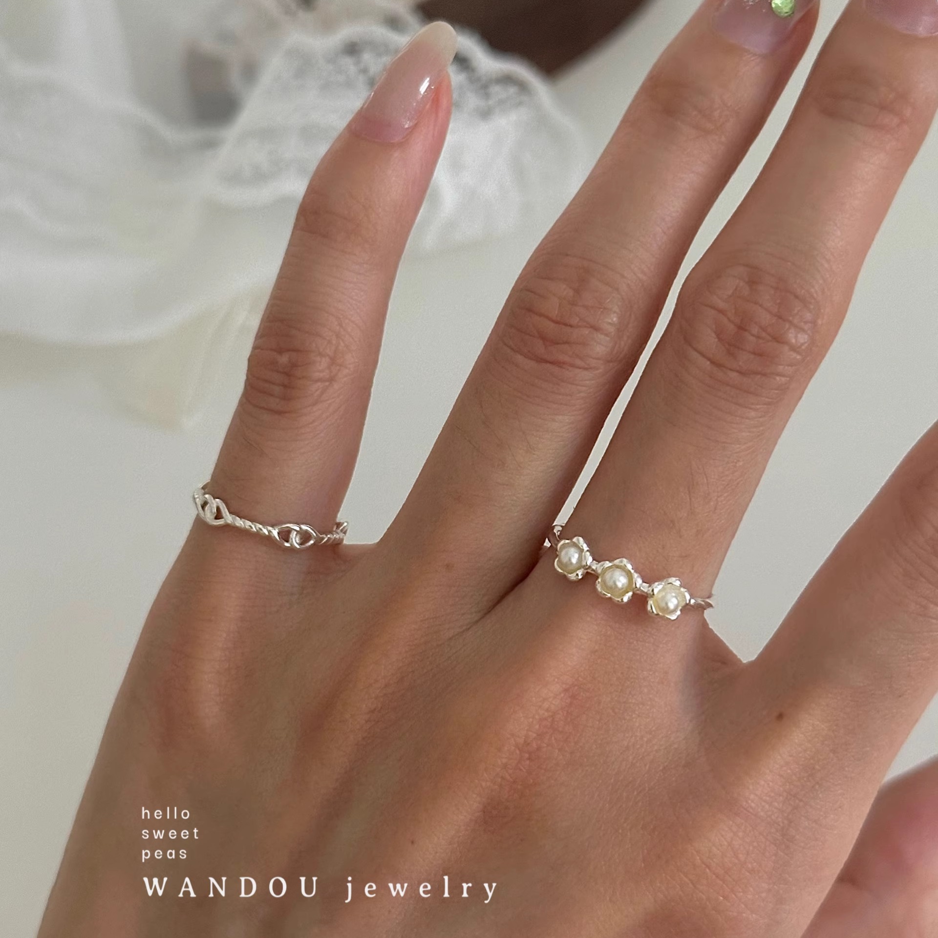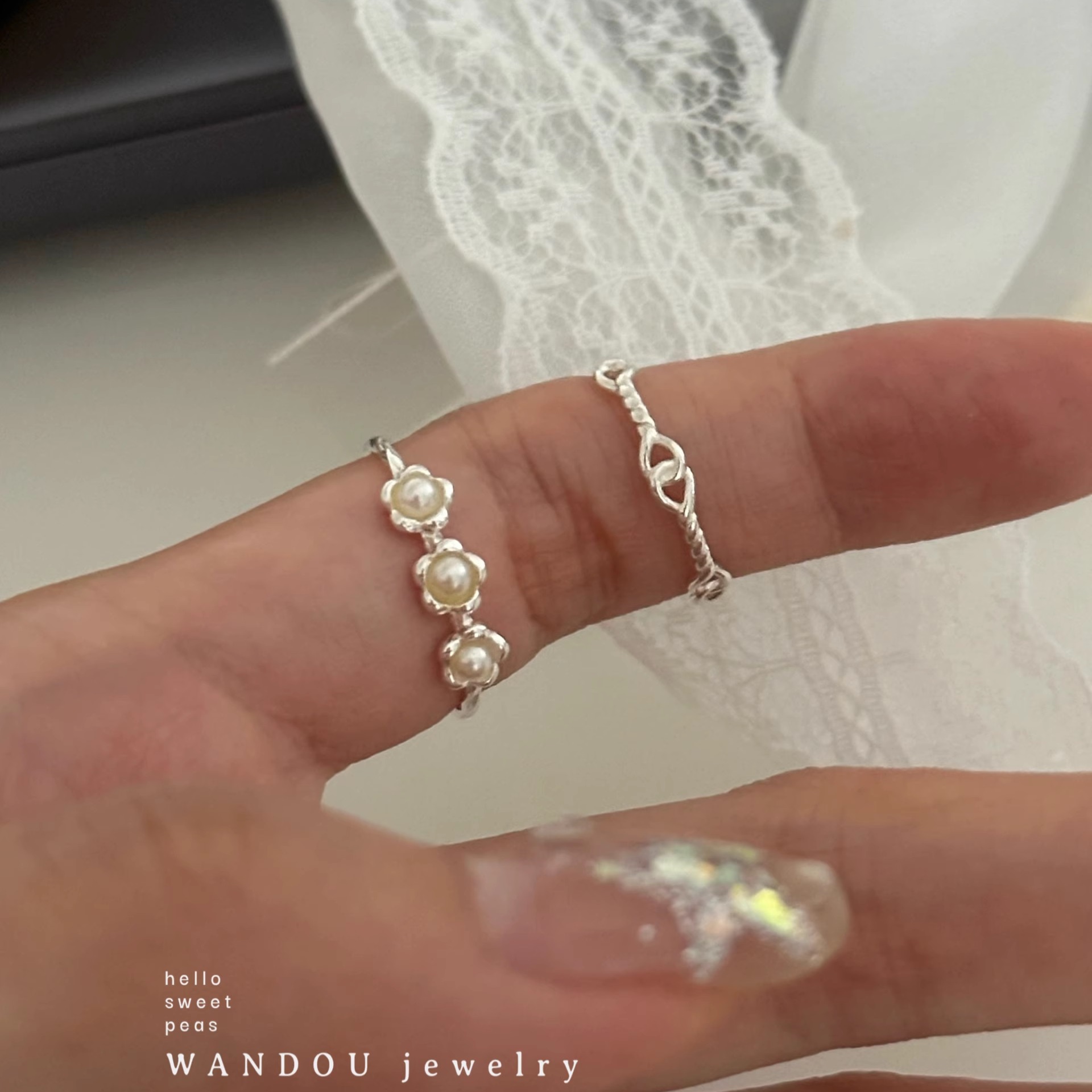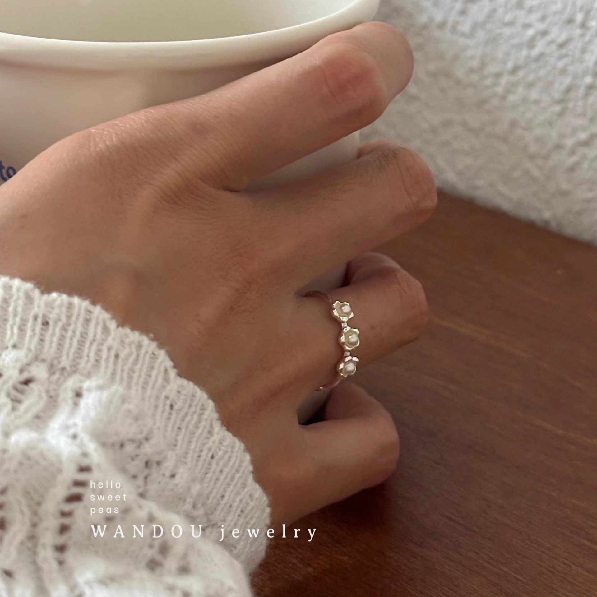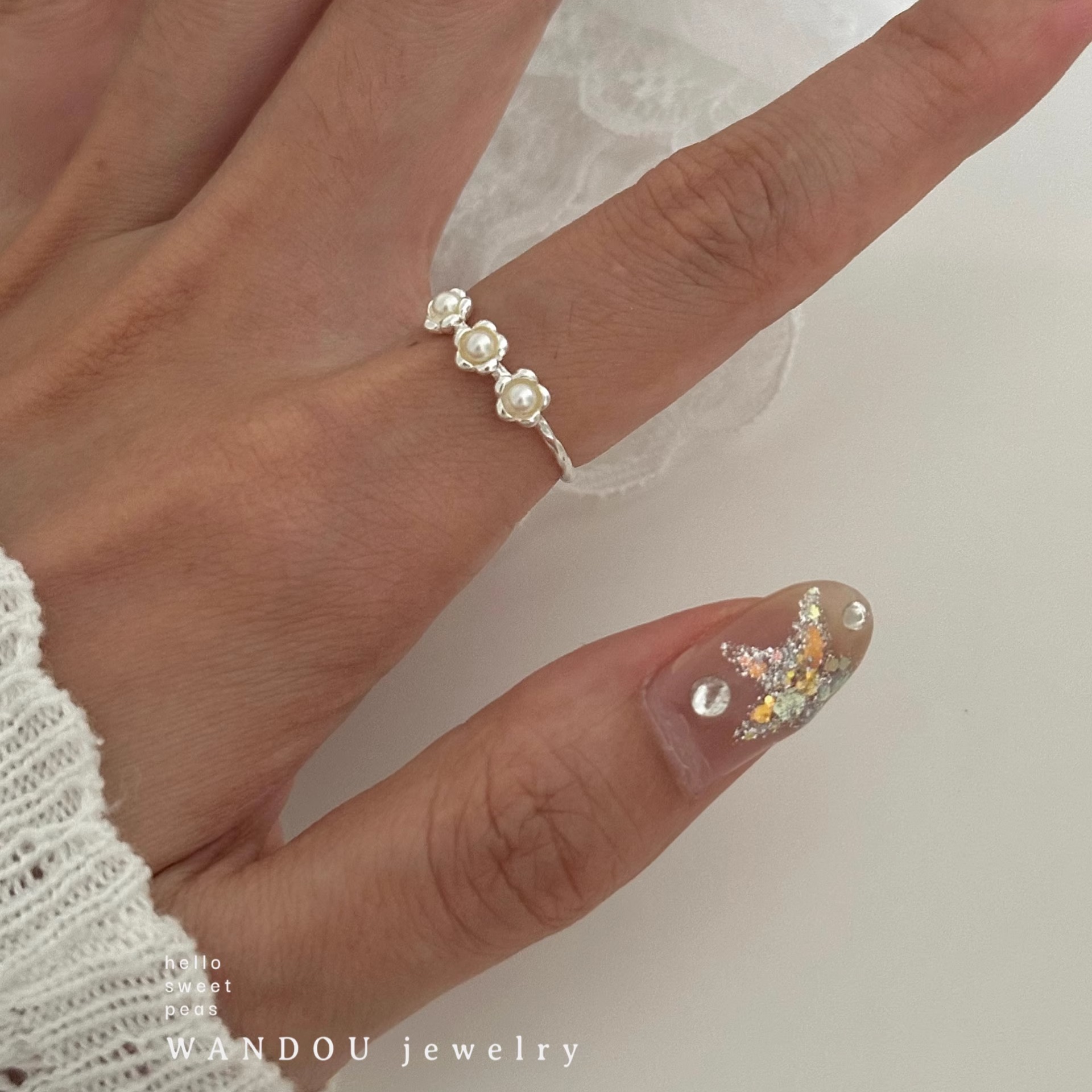小众设计纯银S925珍珠花朵开口戒指环女新款猪鼻尾戒子2024新款